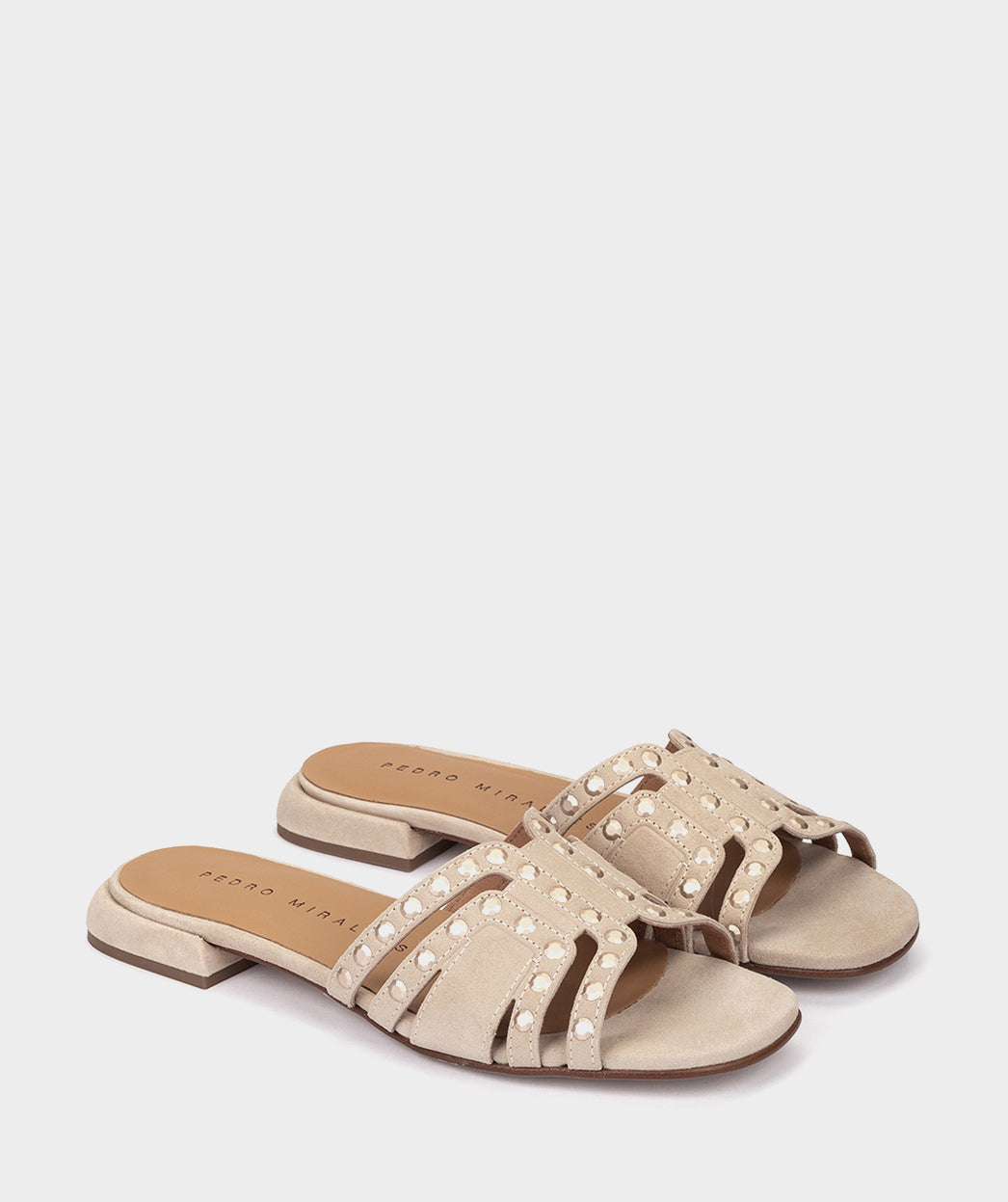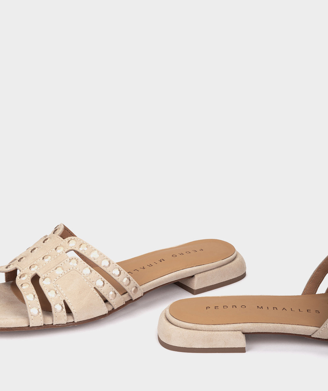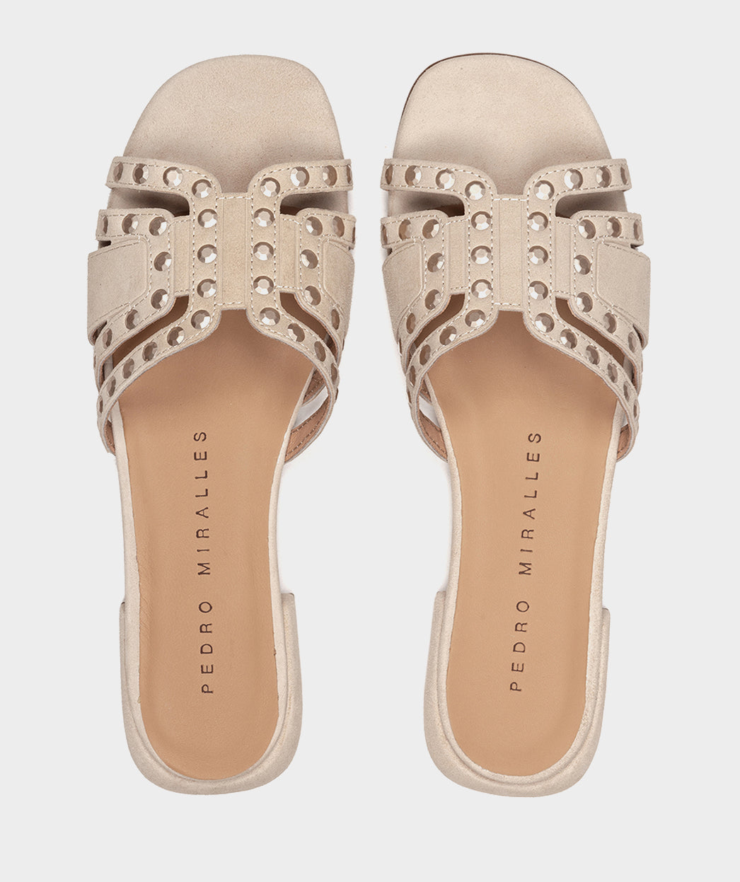Sandales plates en daim beige. Ce modèle a été réalisé avec des clous qui apportent une touche unique et glamour. Le design ergonomique des sandales Garachico épouse la forme naturelle du pied, offrant un maximum de confort sans sacrifier le style.