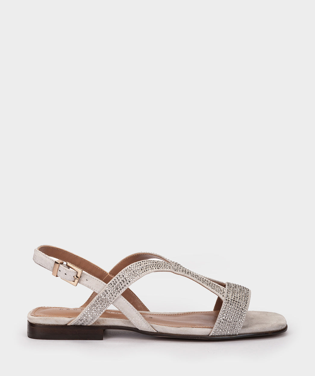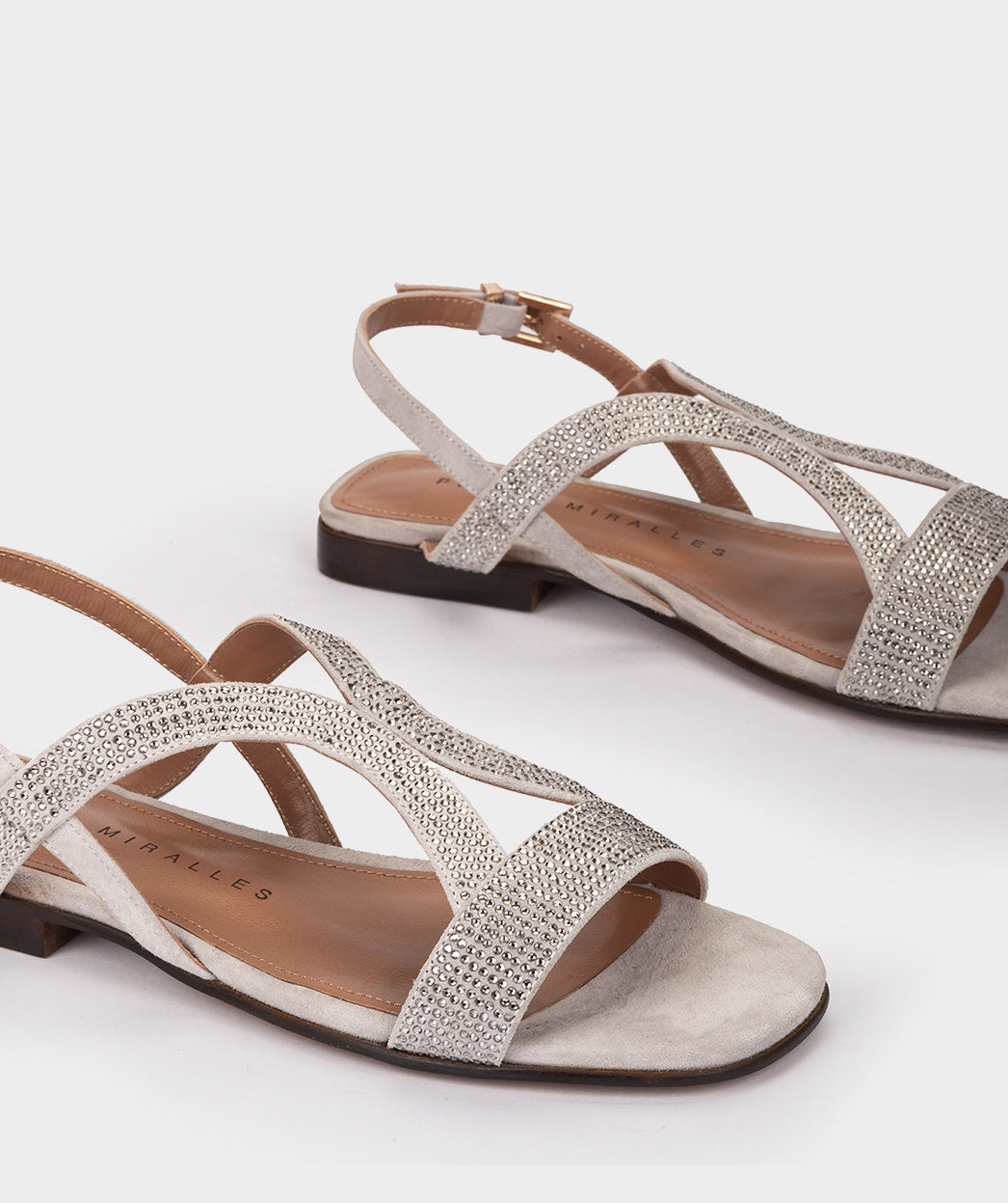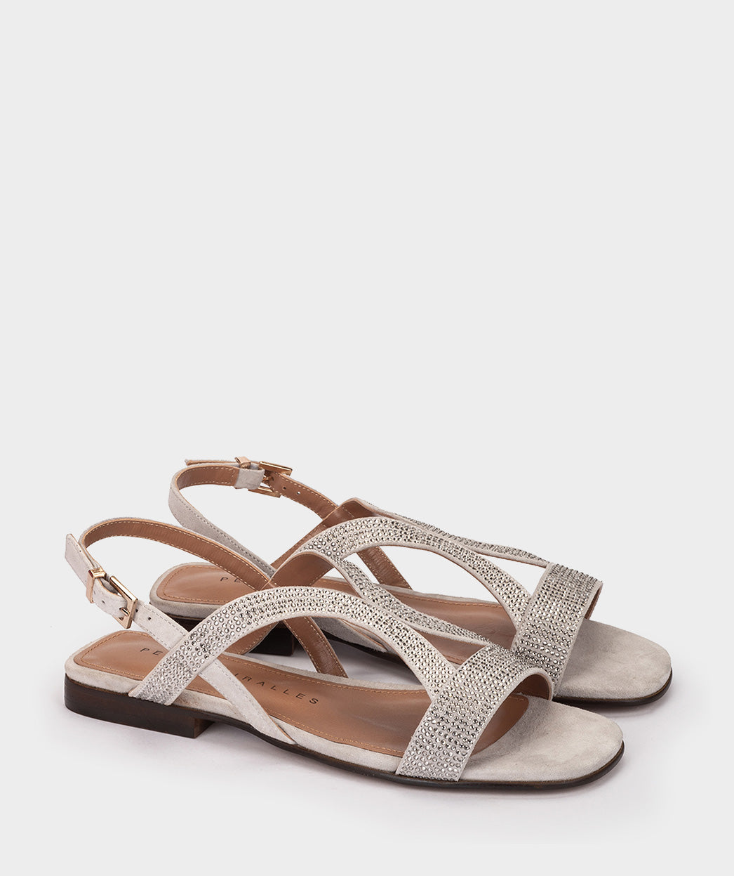 Sandales plates en daim gris. Ce modèle a été réalisé avec de petites pierres brillantes qui ajoutent une touche de luxe à chaque détail de ces sandales.