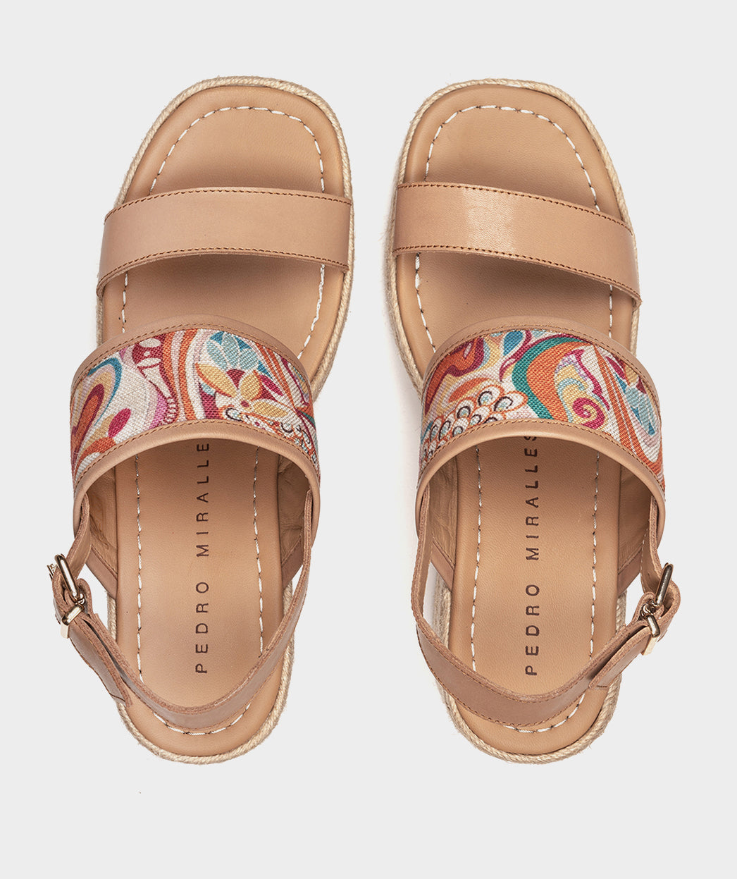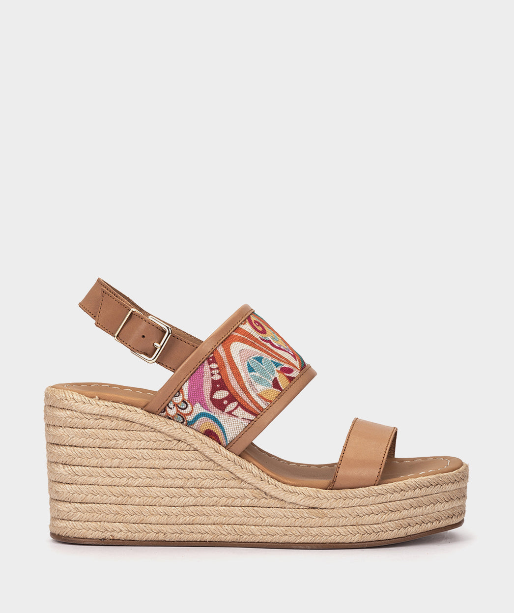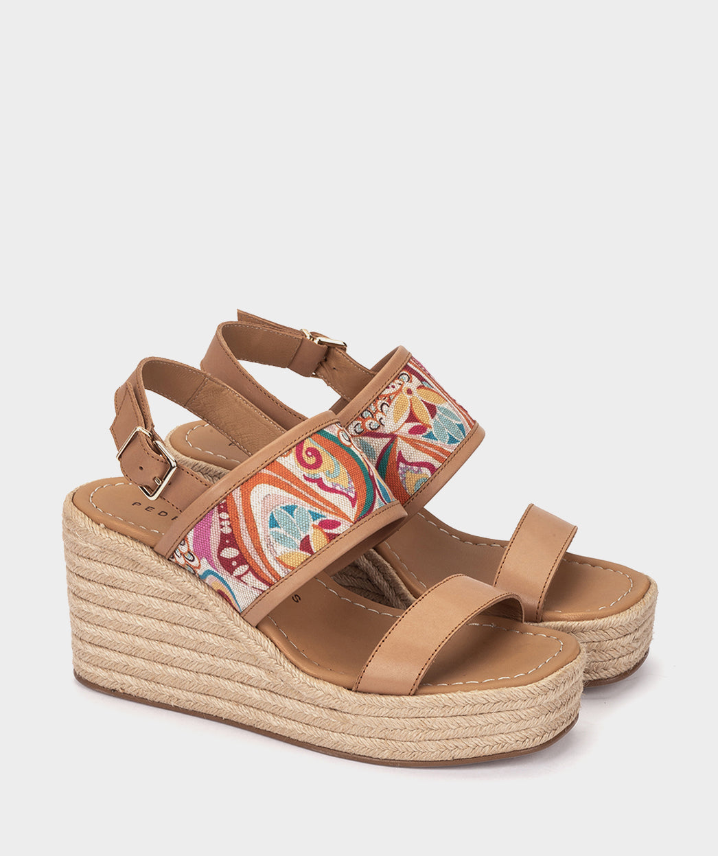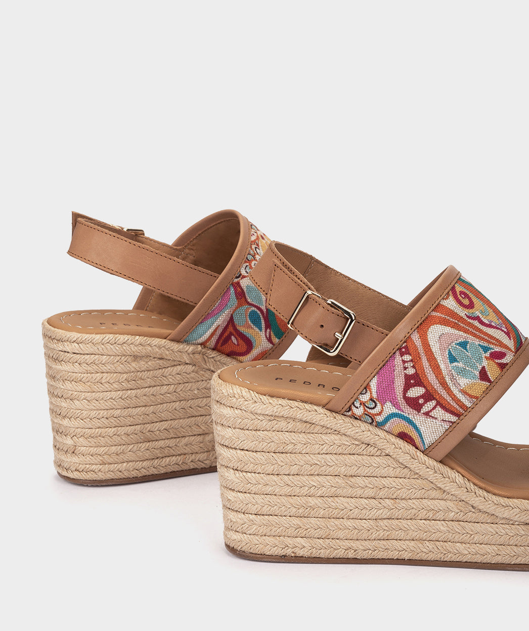 Chaussées compensées avec plateforme en cuir et tissu. Le tissu fantaisie forme des motifs complexes et des détails éblouissants qui éveillent les sens. Chaque étape est une déclaration de style avec les cales Ferragudo.