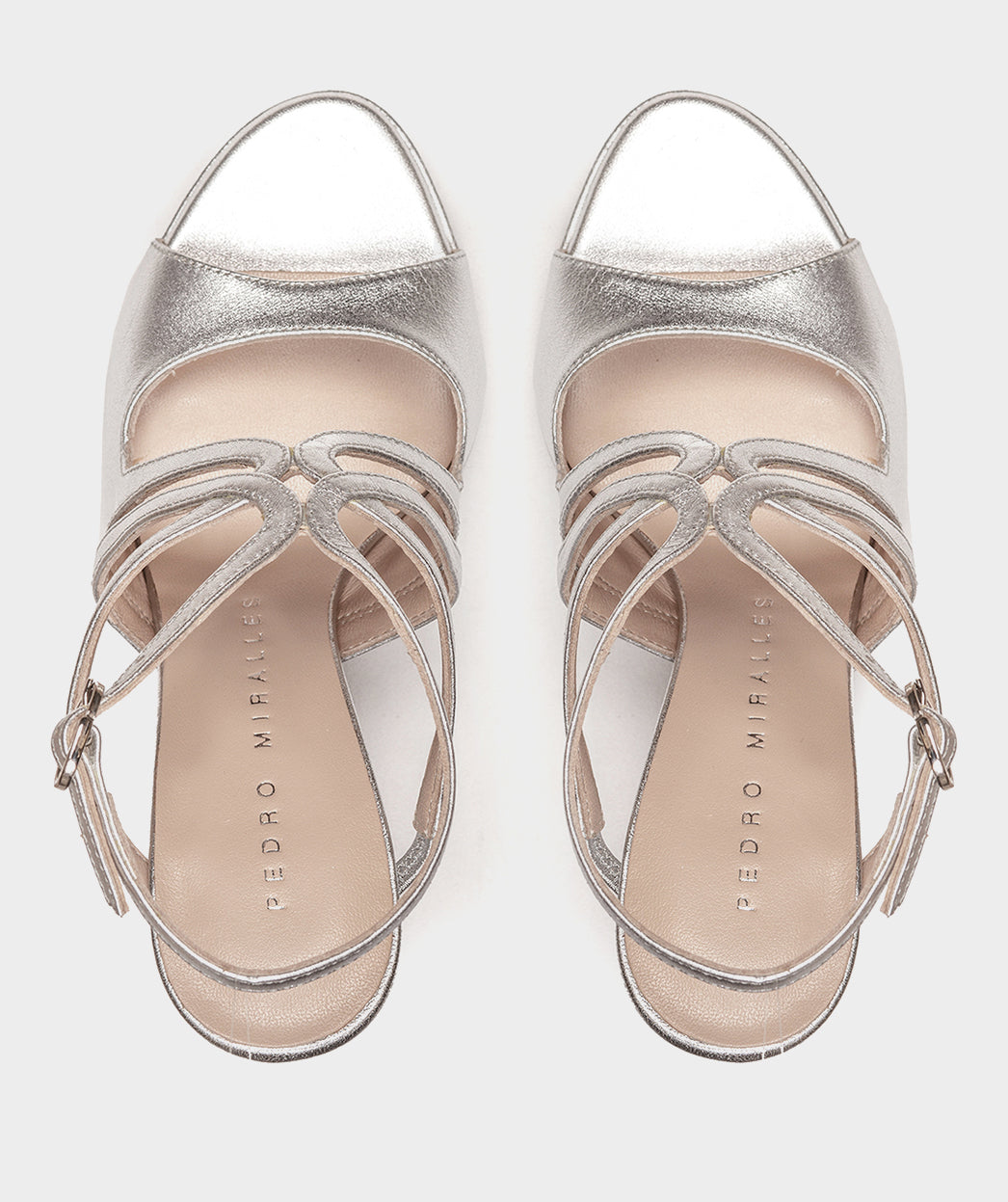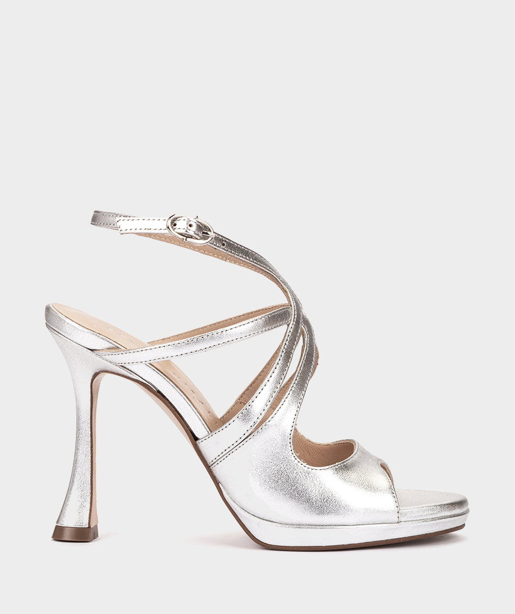 Sandales à talons en cuir métallisé argenté. Fabriqué avec des bandes de différentes tailles qui se croisent pour offrir un maintien optimal. Vous serez le plus élégant de vos événements.
