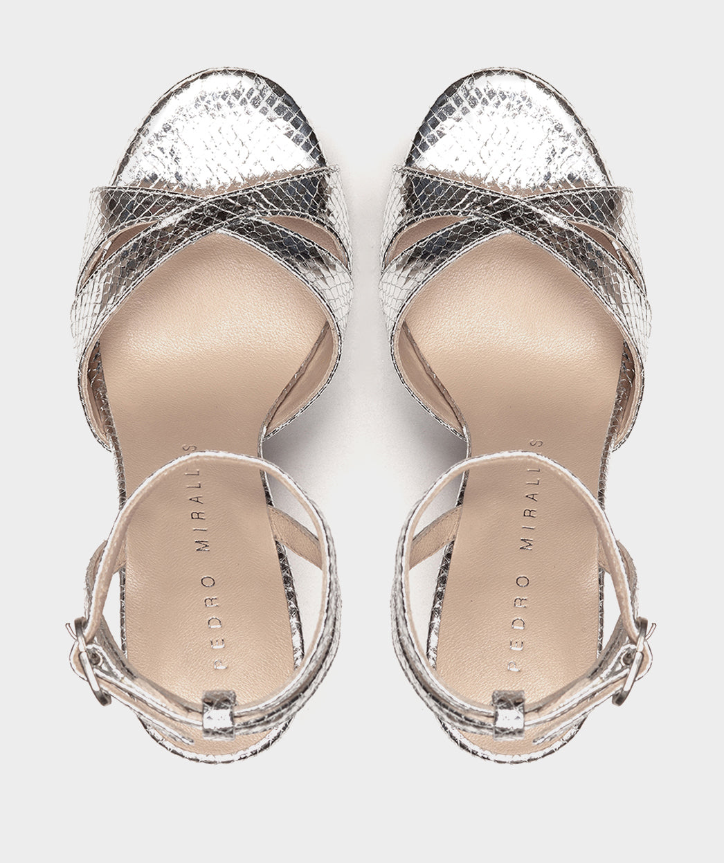 Sandales à talons avec plateforme en cuir métallisé gravé de couleur acier. Emportez avec vous une combinaison parfaite de confort et de style qui ne passera pas inaperçue.