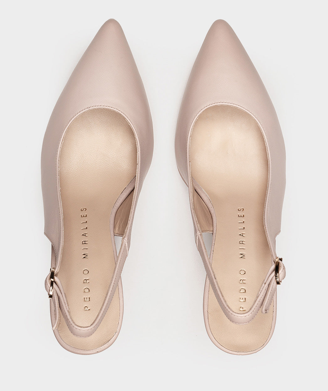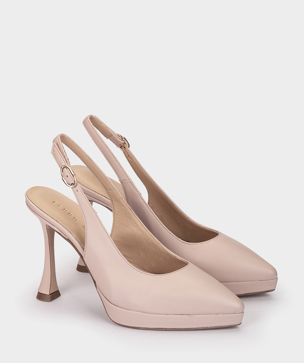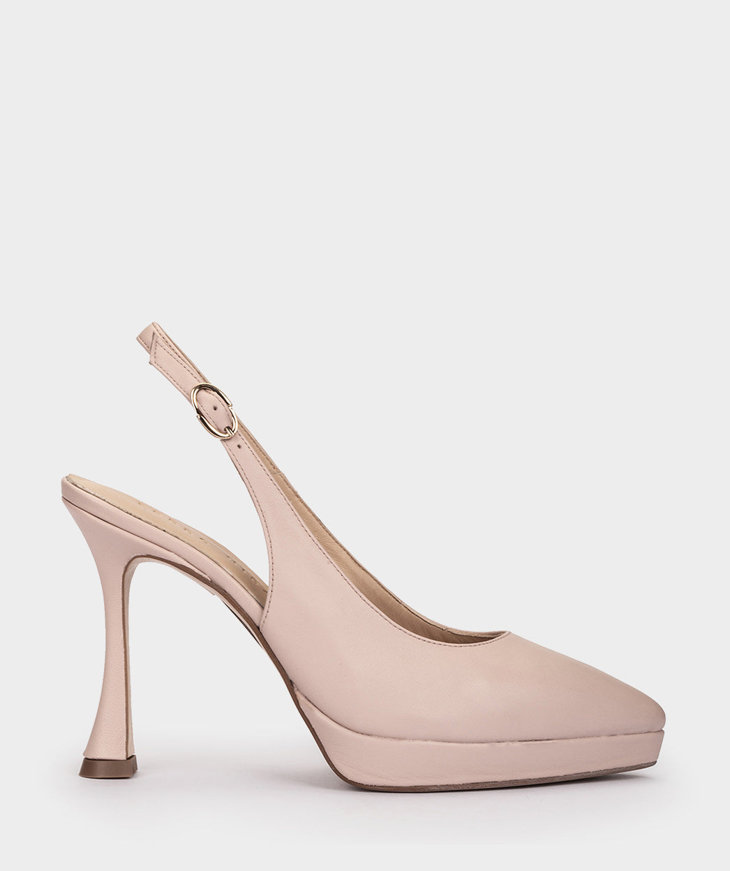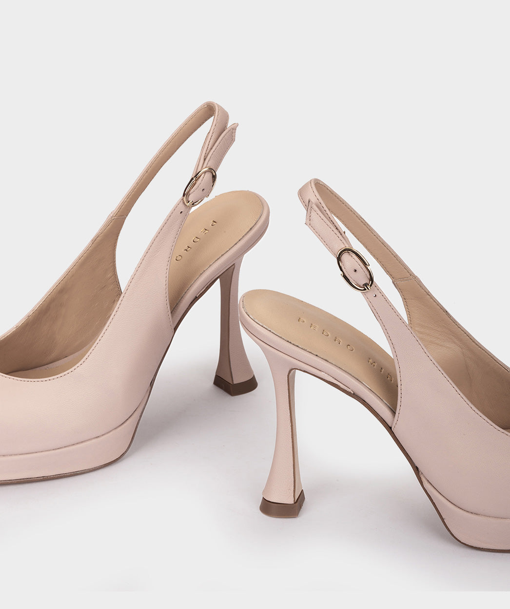 Escarpins plateforme à bride arrière, en cuir rose pâle. Le modèle Rena est une nouvelle version de nos escarpins emblématiques qui vous offriront une hauteur élégante sans sacrifier le confort.
