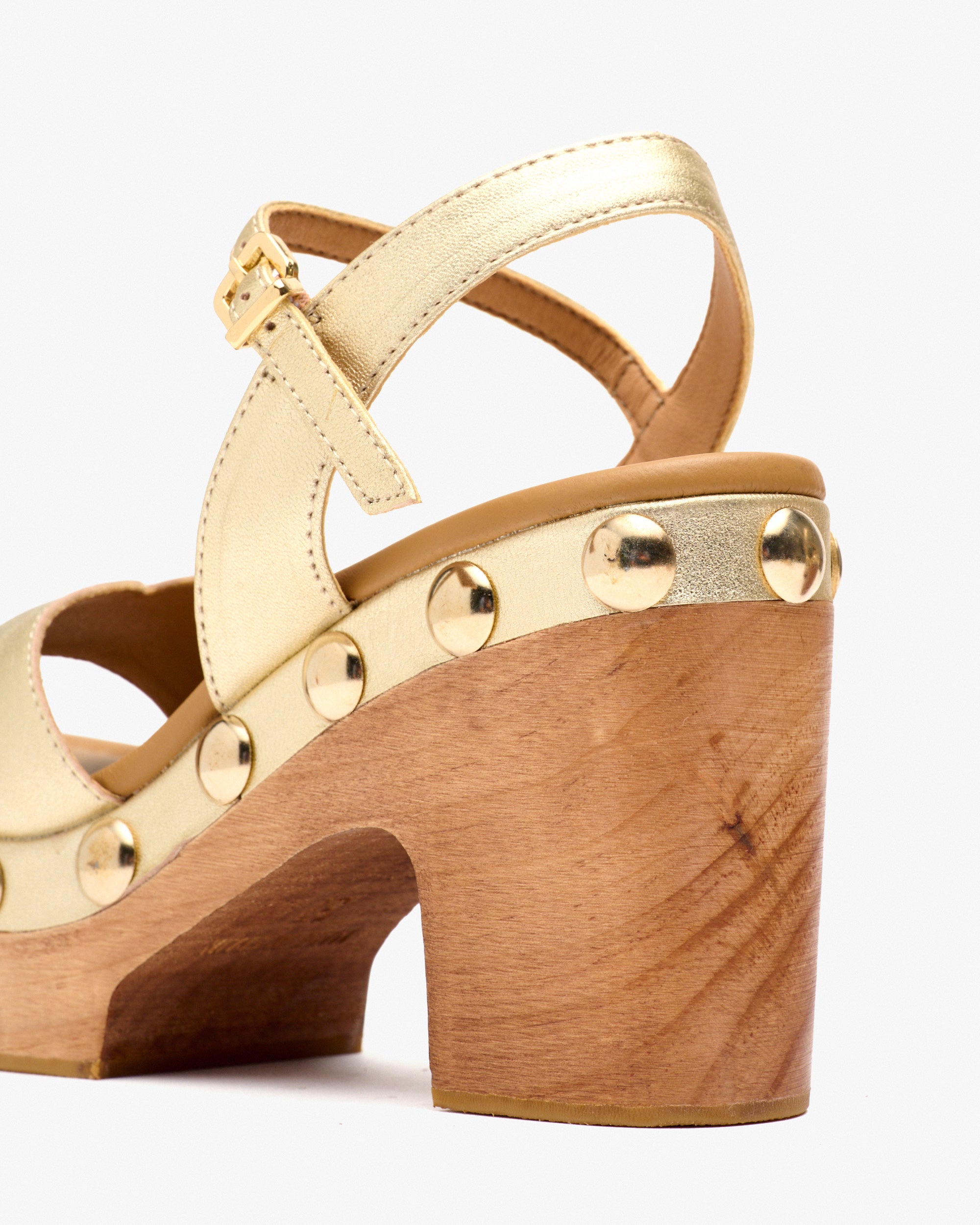 Sandales à talons en cuir métallisé platine avec clous. Un modèle de style nineties qui combine l’esthétique boho-chic avec des détails de clous. Sa silhouette offre un maintien optimal.