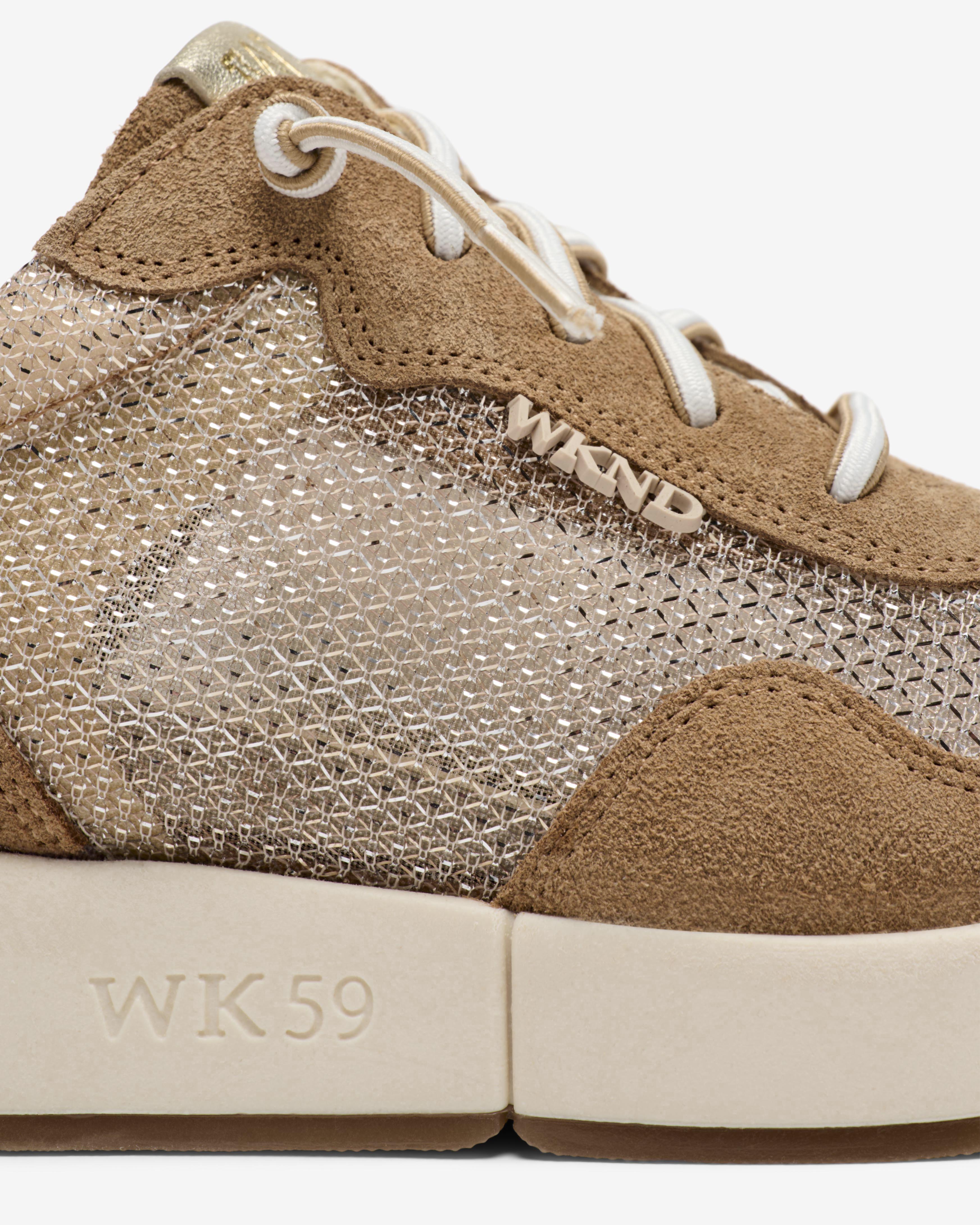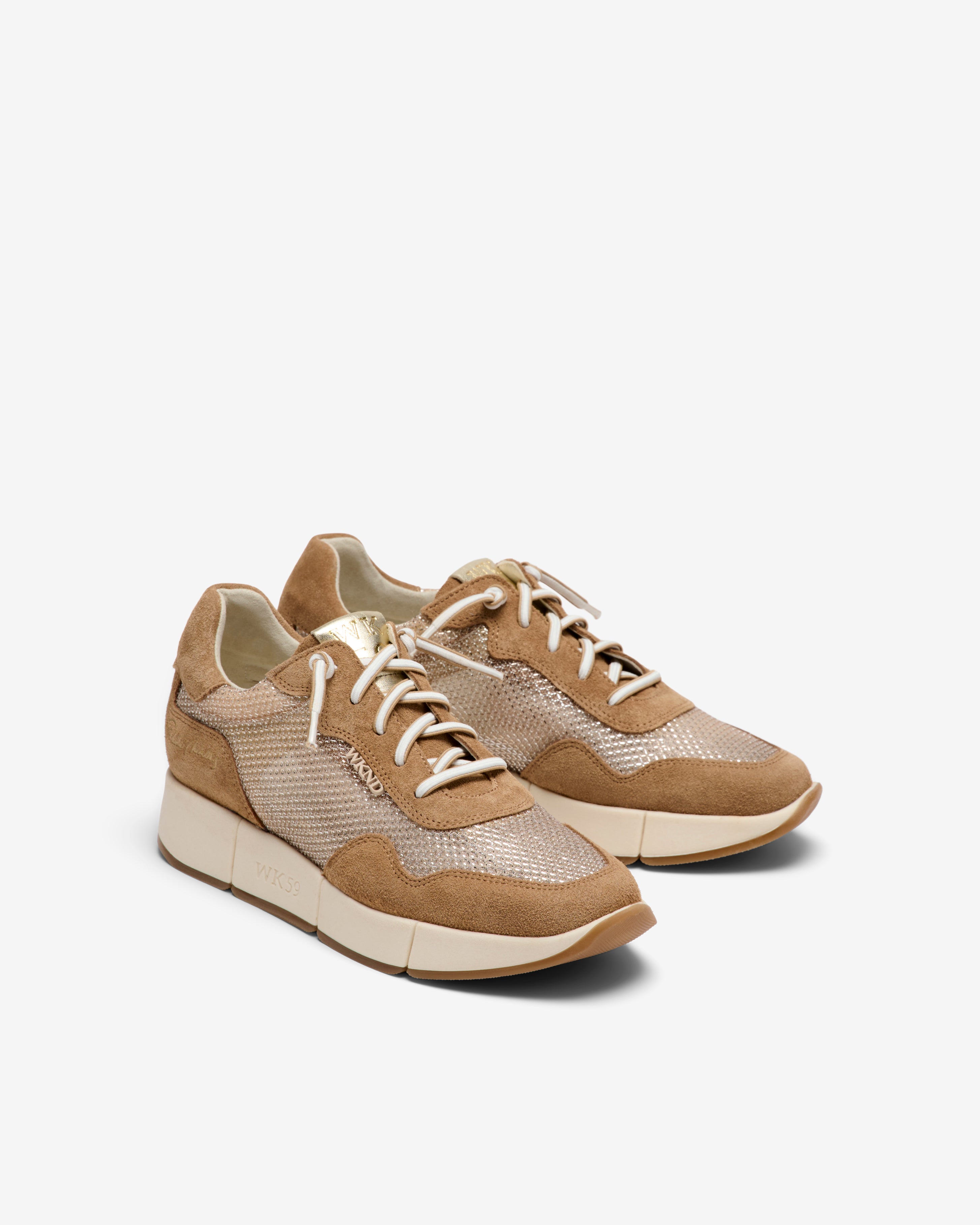 Chaussures de sport en daim marron et en maille platine. Un design qui allie élégance, confort et originalité. Leur texture douce et leur teinte unique en font le choix parfait pour un style moderne, décontracté et distinctif. Elle possède une semelle amovible. Ce modèle appartient à la gamme Weekend by Pedro Miralles.