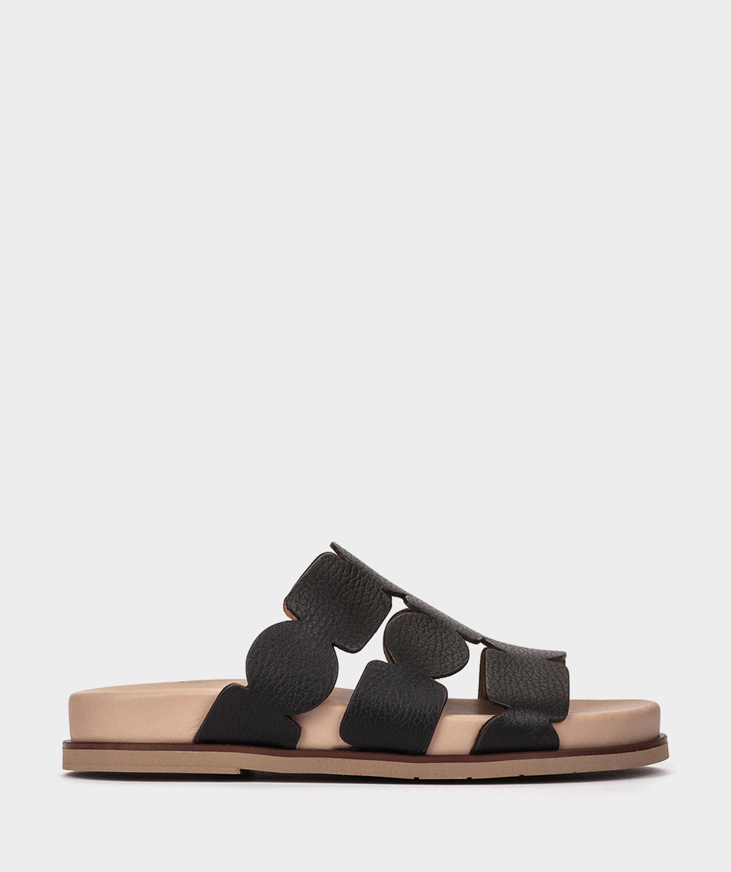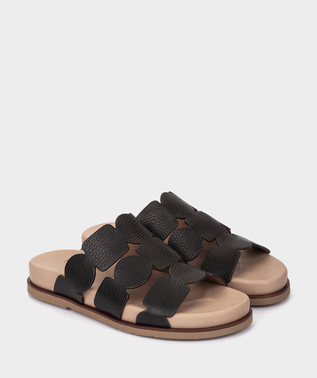 Sandales plates en cuir noir. L'option parfaite à porter pendant les journées d'été. Sa tige, composée de trois bandes aux formes géométriques, ajoute de l'originalité au modèle. Un modèle qui se distingue par son confort et son design.