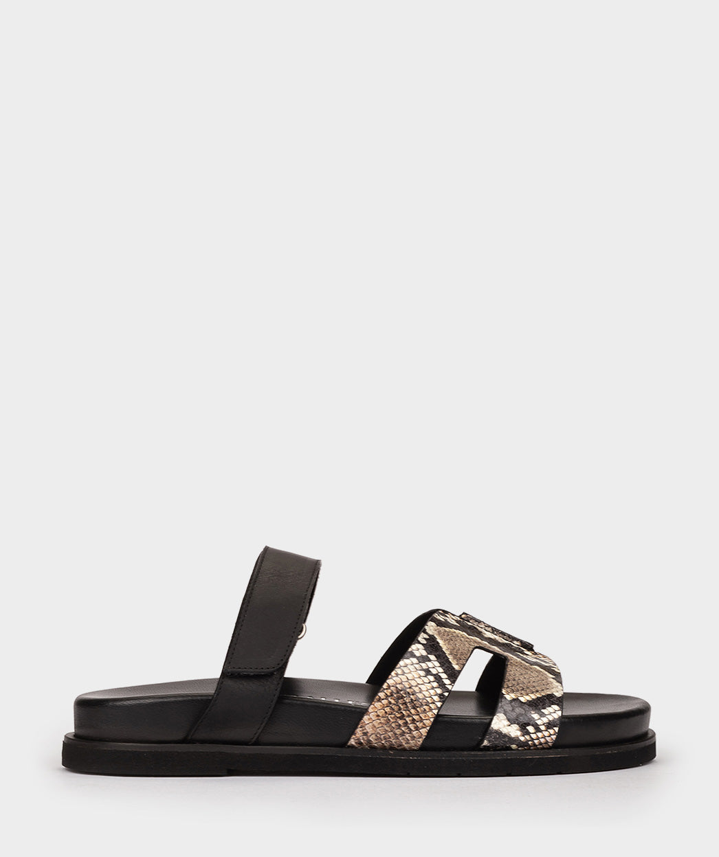 Sandales plates en cuir avec imprimé serpent. Une option parfaite pour un usage quotidien et un engagement envers le style sans sacrifier le confort. Sa silhouette offre un maintien optimal du pied pour une marche confortable.