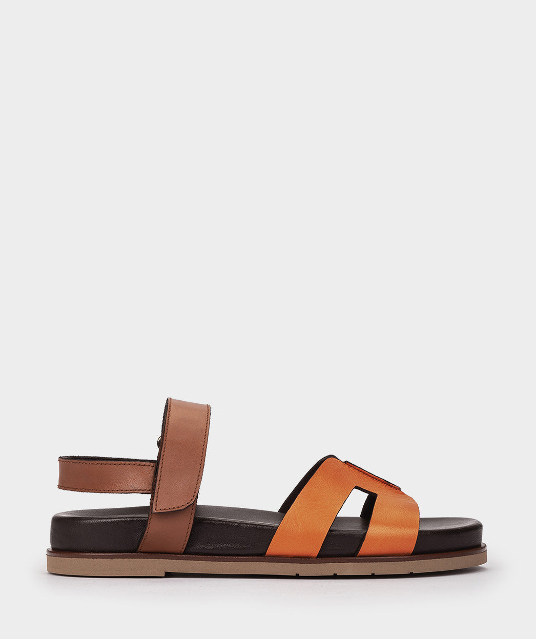 Sandales plates en cuir marron et orange. Un modèle de créateur à porter au quotidien. Il dispose d'une fermeture velcro pour un ajustement confortable et facile. La combinaison du cuir lisse et de l'imprimé serpent ajoute sophistication et tendance au modèle.