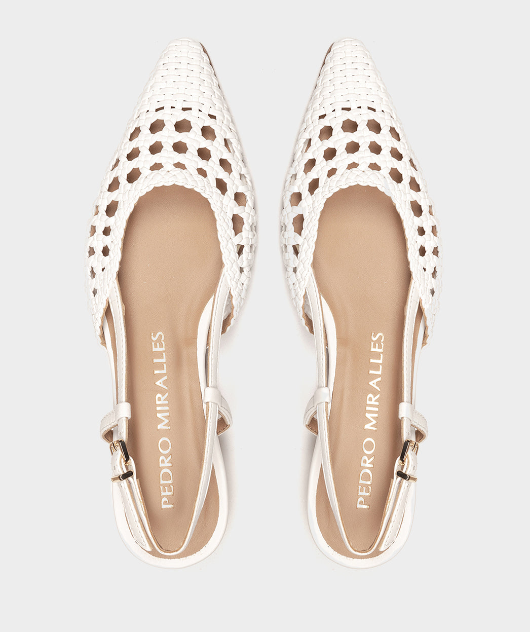 Chaussures blanches tressées sans dos avec un bout pointu. Les chaussures SANTO DOMINGO offrent une combinaison parfaite de confort et de mode. Combinez-les avec vos pièces préférées de la saison.