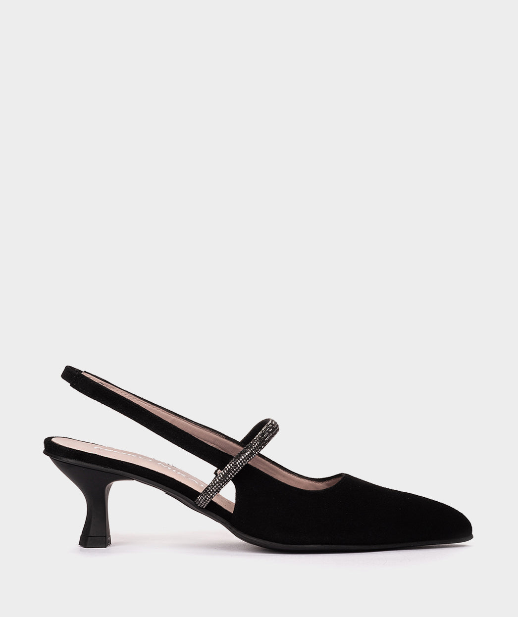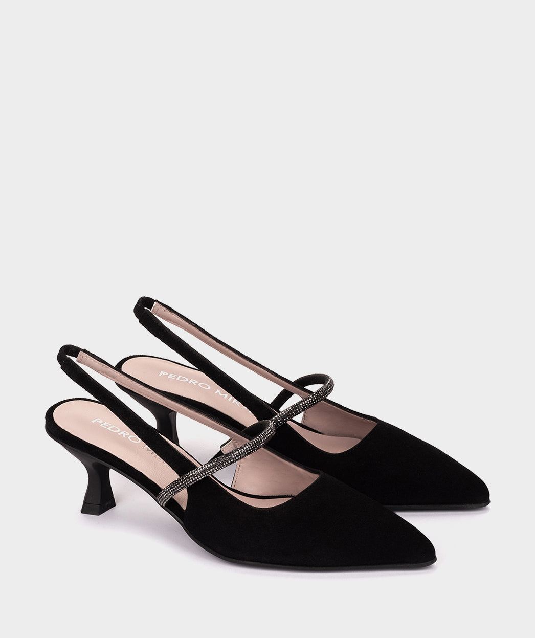 Escarpins à talons en daim noir. Ce design simple et élégant a la touche de sophistication parfaite grâce à la bande de diamants. Le modèle IZAGRE est conçu pour ceux qui recherchent un style basique avec un détail particulier.