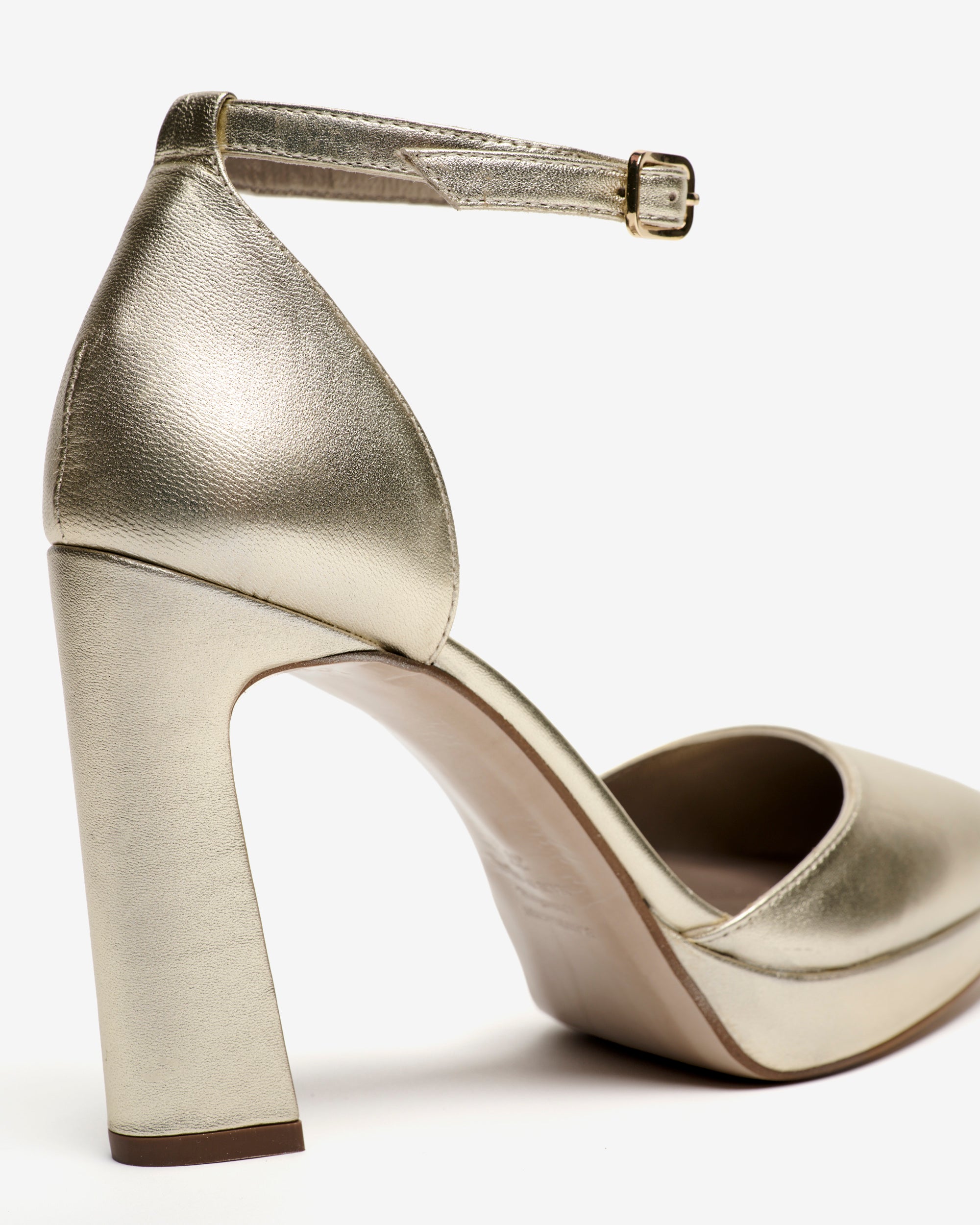 Talons hauts en cuir métallique platine. Une nouvelle version du modèle WARSAW avec un talon plus épais. La silhouette de ces chaussures est élégante et sophistiquée, avec un bout fin qui s’allonge délicatement. La plateforme, soigneusement intégrée au design, ajoute hauteur et stabilité.