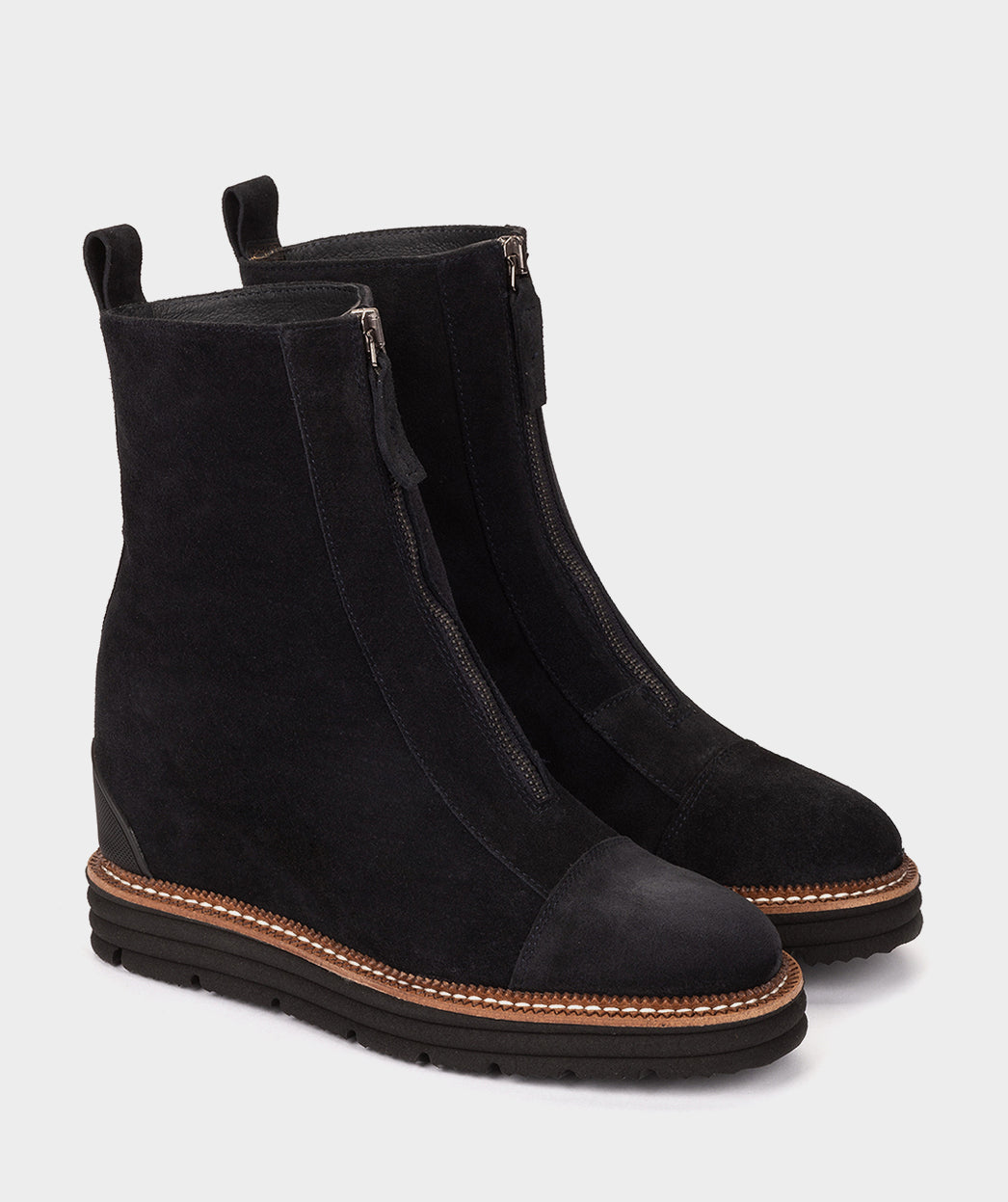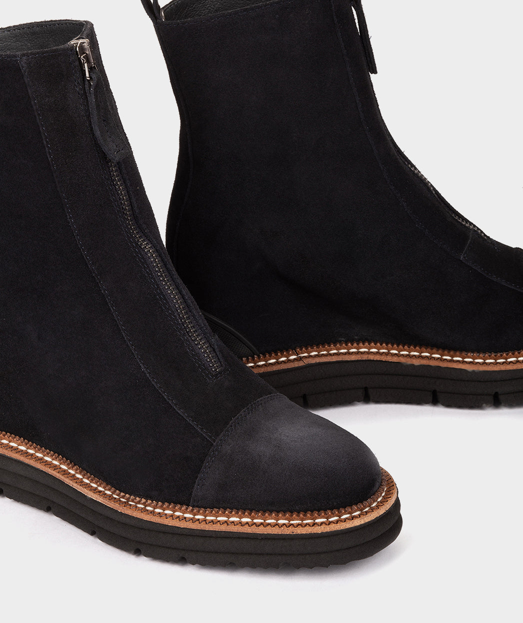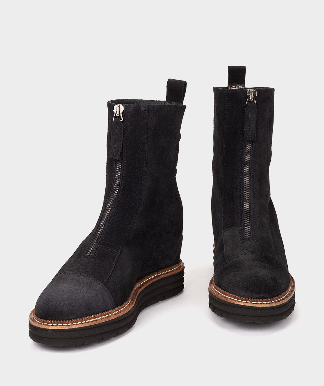Bottines en daim bleu avec fermeture éclair. Le modèle PALERMO se distingue par son design original. La fermeture éclair qui traverse la tige de la botte capte toute l'attention et ajoute de la distinction au modèle.