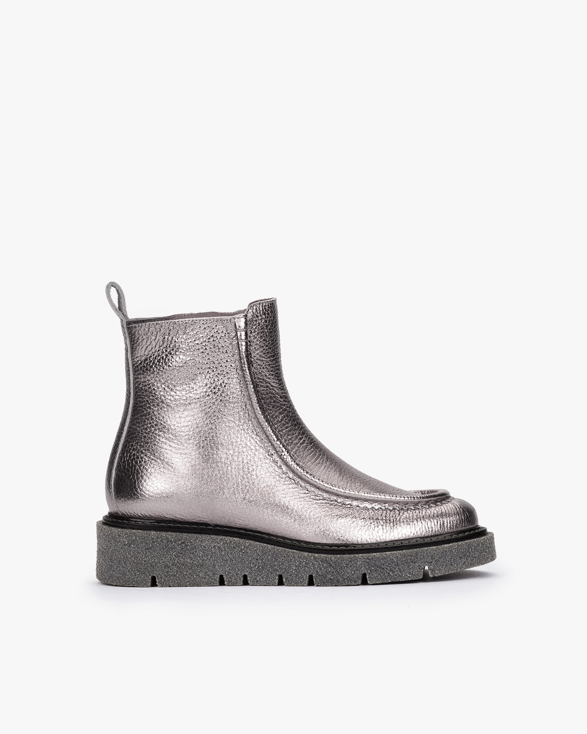 Des bottines métalliques argentées en cuir métallique. Un design polyvalent conçu pour être porté au quotidien. Le détail de la couture sur la silhouette lui confère distinction et originalité. La rugosité de la semelle permet une adhérence optimale au sol.