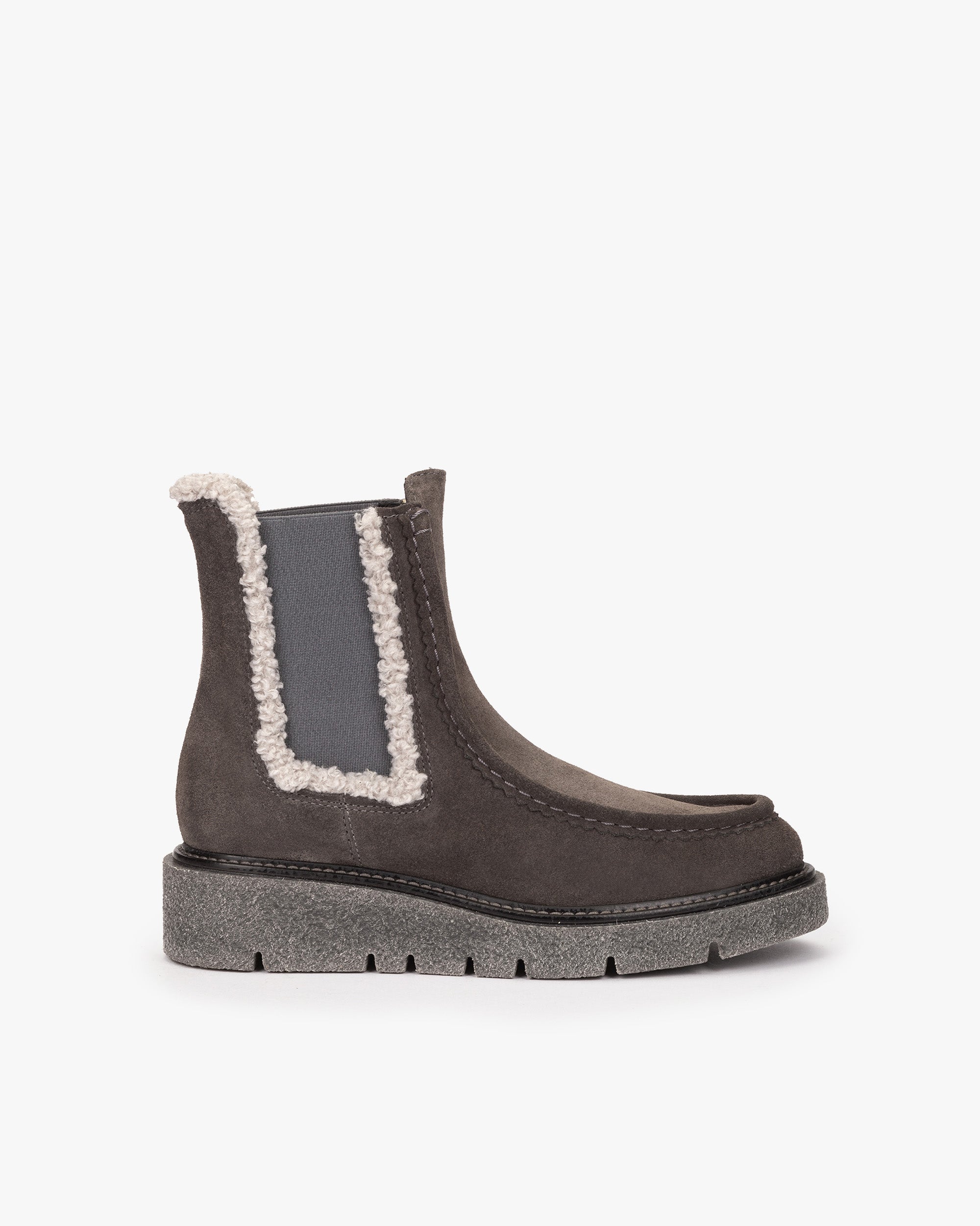 Bottines en daim gris avec élastiques latéraux. Les bottines TIUMEN se distinguent par un détail latéral délicat avec un effet de shearling, qui apporte de l’originalité au modèle. Leur texture douce et leur design élégant apportent chaleur et confort, faisant de ces bottines un choix parfait pour les journées froides.
