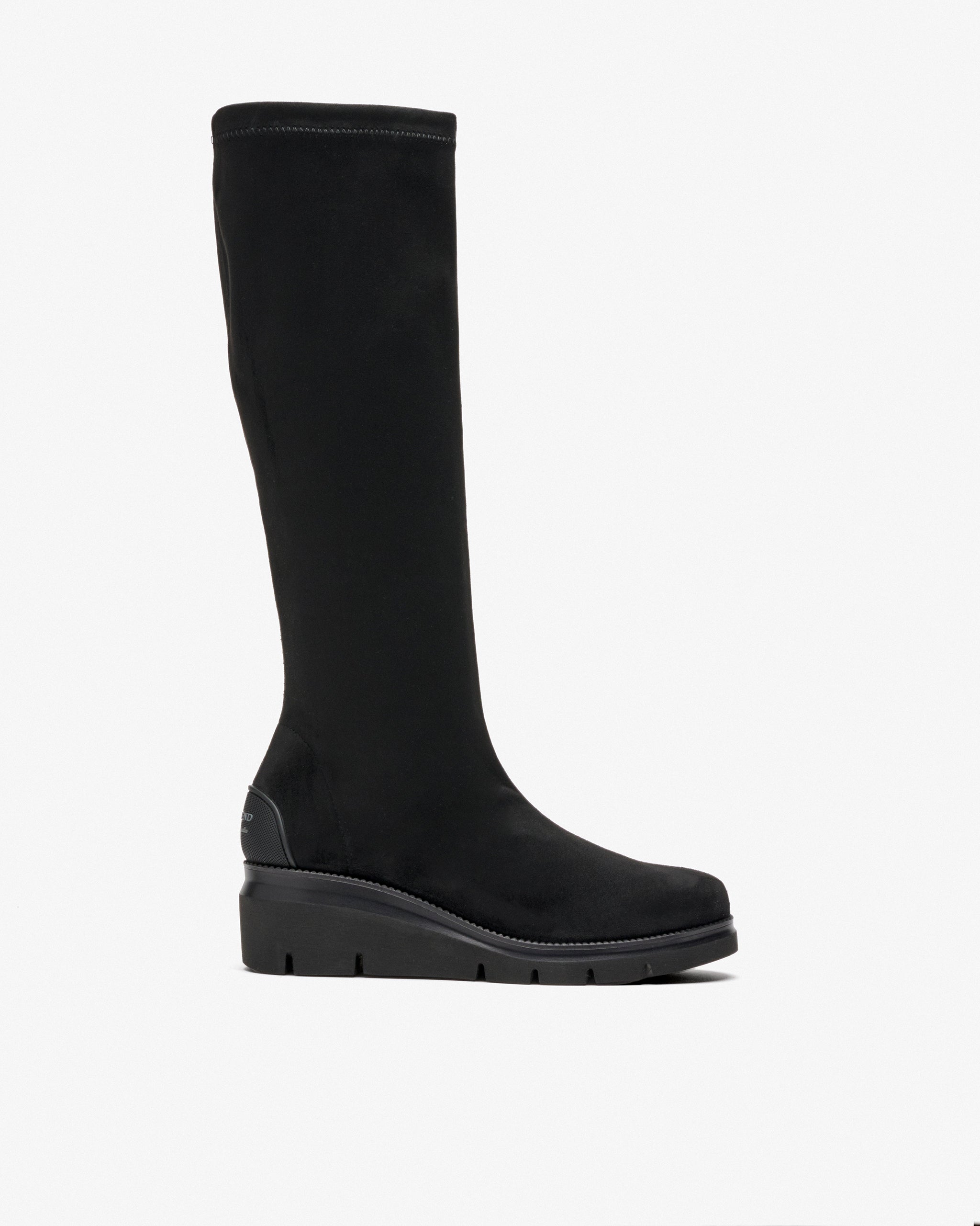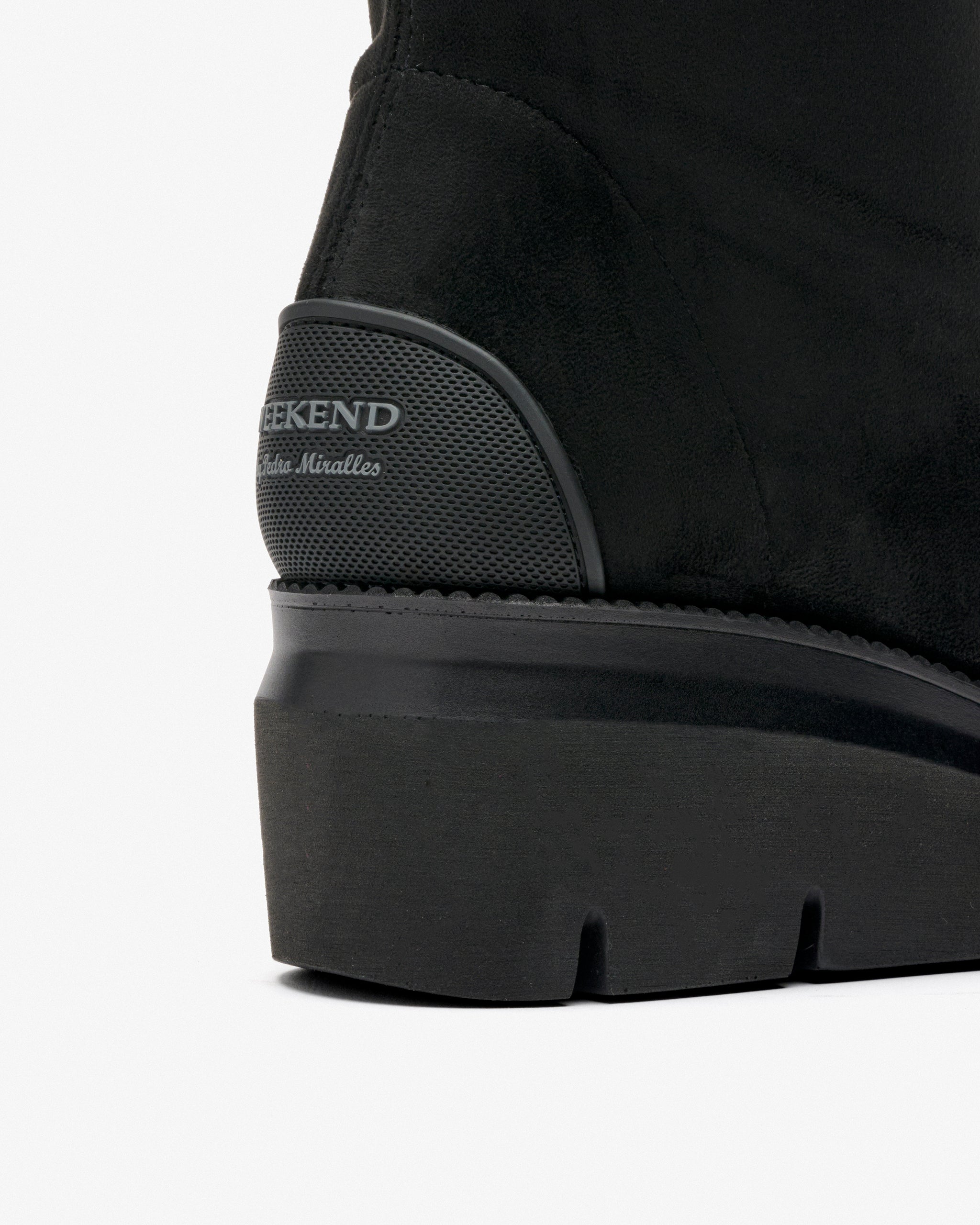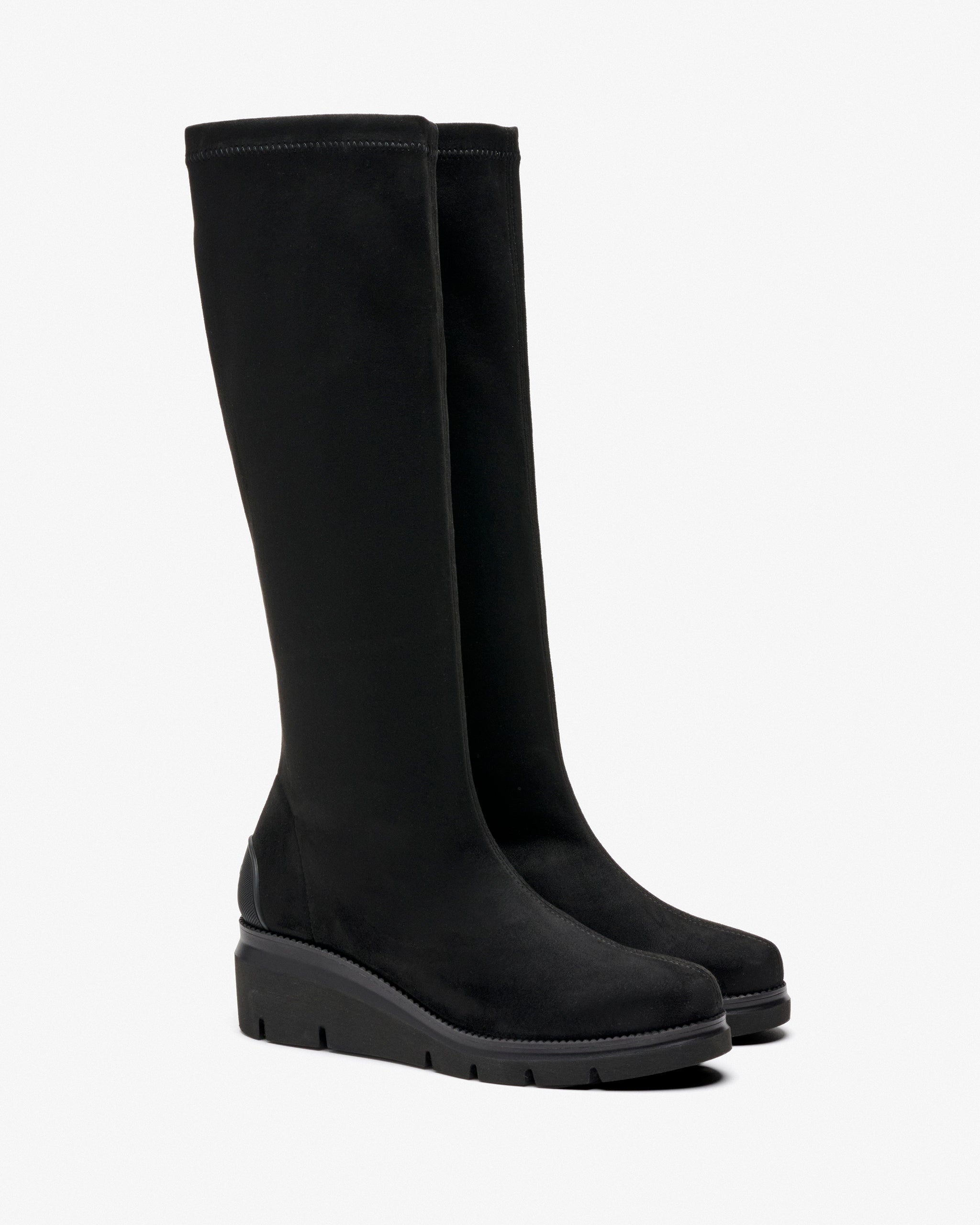 Bottes en tissu stretch effet daim noir. Conçu pour allier style et confort. Son tissu ajusté épouse parfaitement le pied, tandis que la plate-forme ajoute de la hauteur. Sa forme large assure un ajustement spacieux et agréable même après des heures d’utilisation.