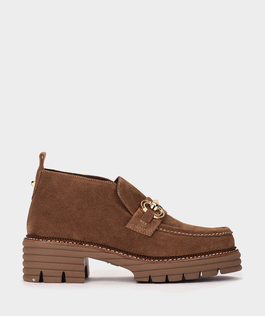 Chaussure en daim marron avec plateforme.La boucle sur le cou-de-pied apporte une touche originale et ajoute de la personnalité au modèle.