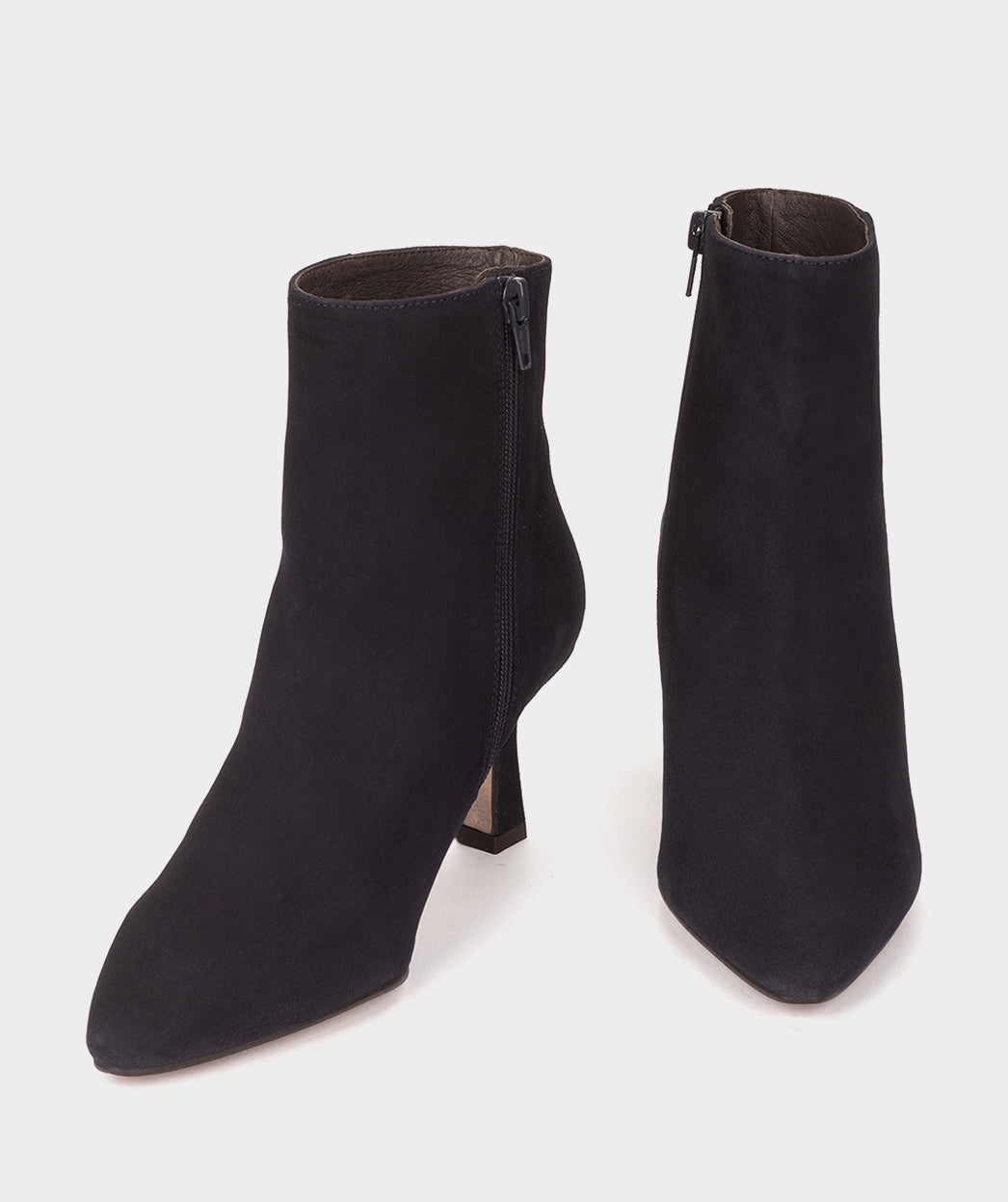 Bottines à talons et bouts pointus, confectionnées en daim bleu marine. Un design qui allie style et polyvalence, offrant une option élégante et intemporelle pour diverses occasions.