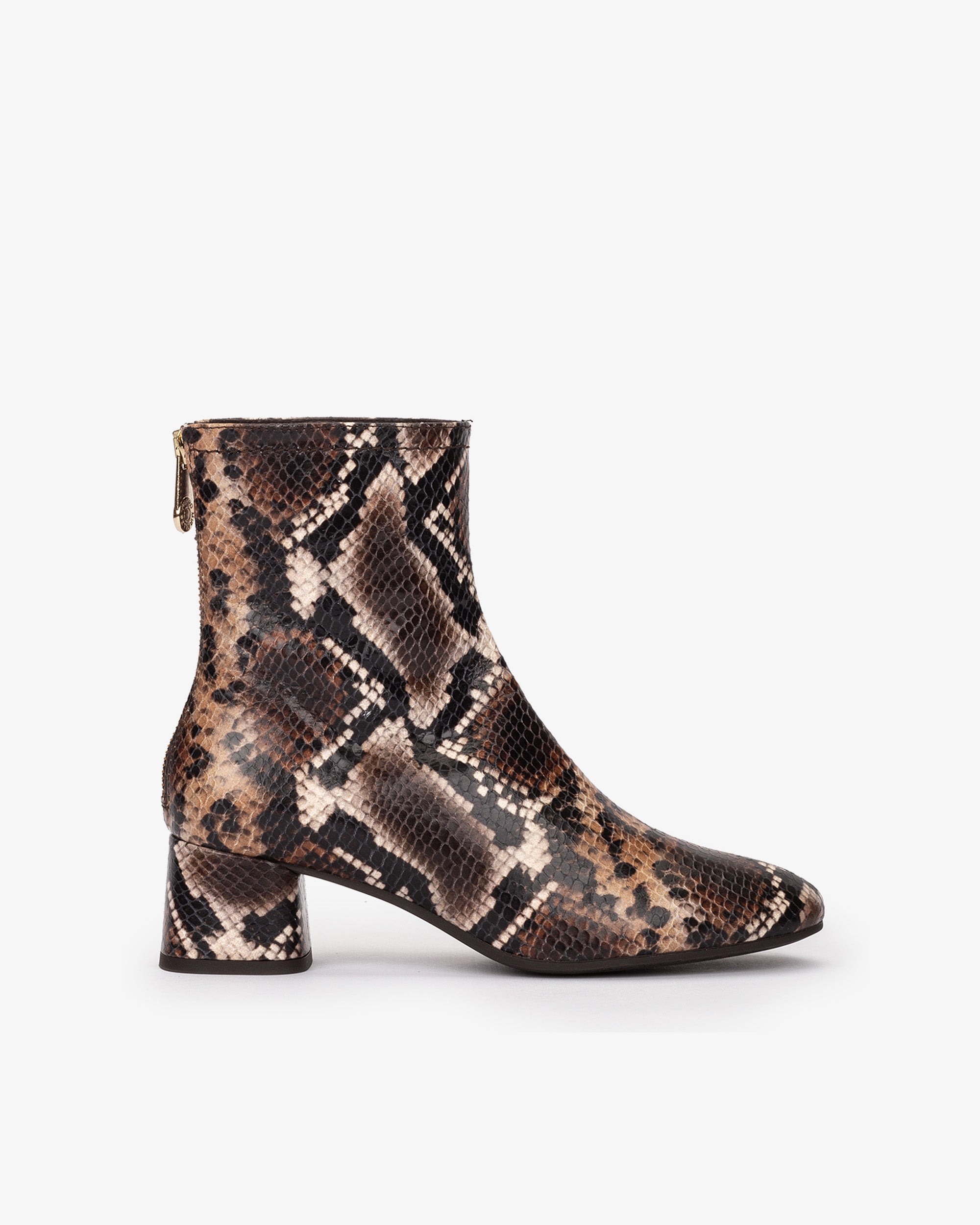 Bottines en cuir marron imprimé serpent. Une bottine classique et très polyvalente avec une touche innovante grâce à son talon rond. Il est doté d’une fermeture éclair au dos. Ce sera le modèle parfait à combiner avec tous vos looks !