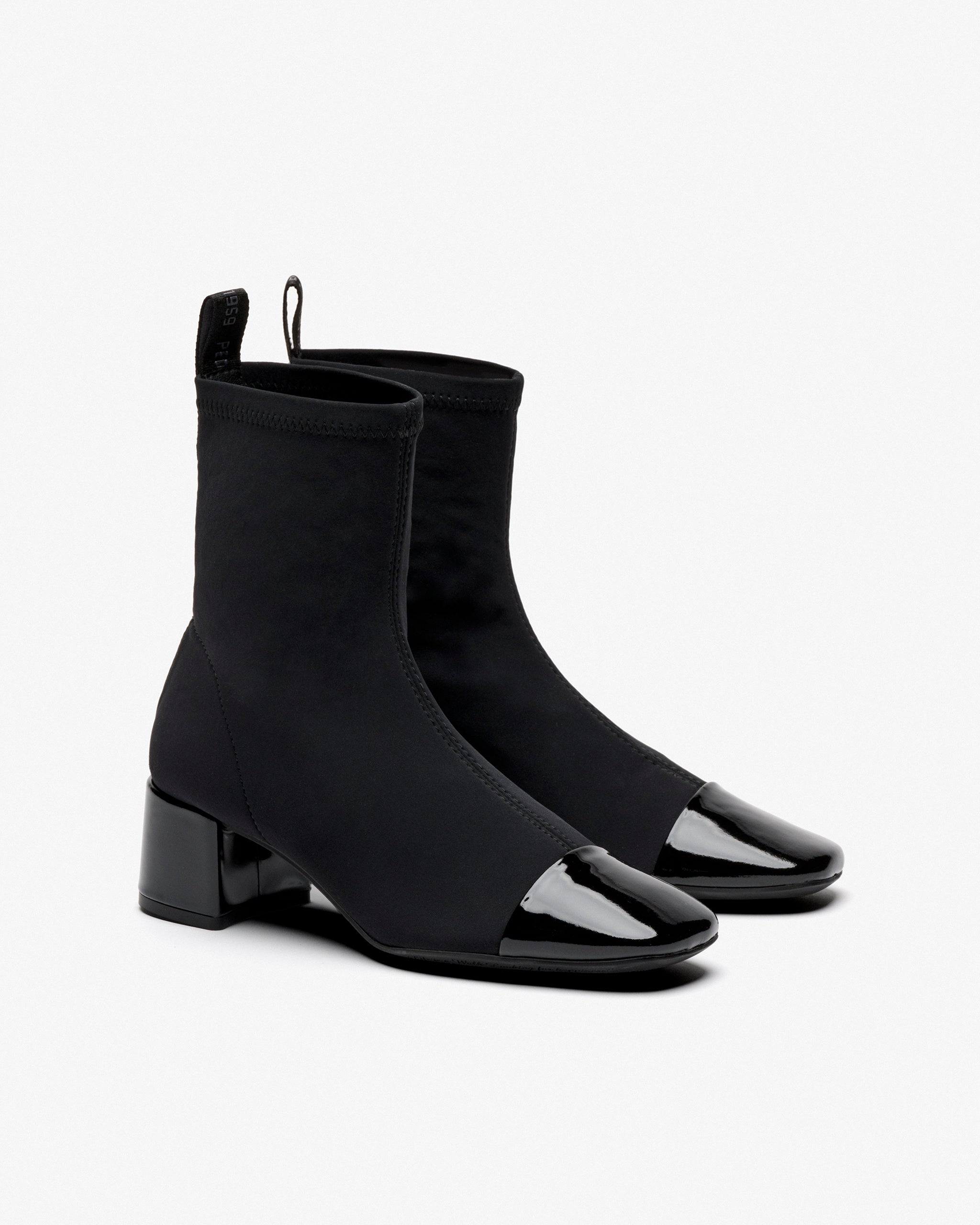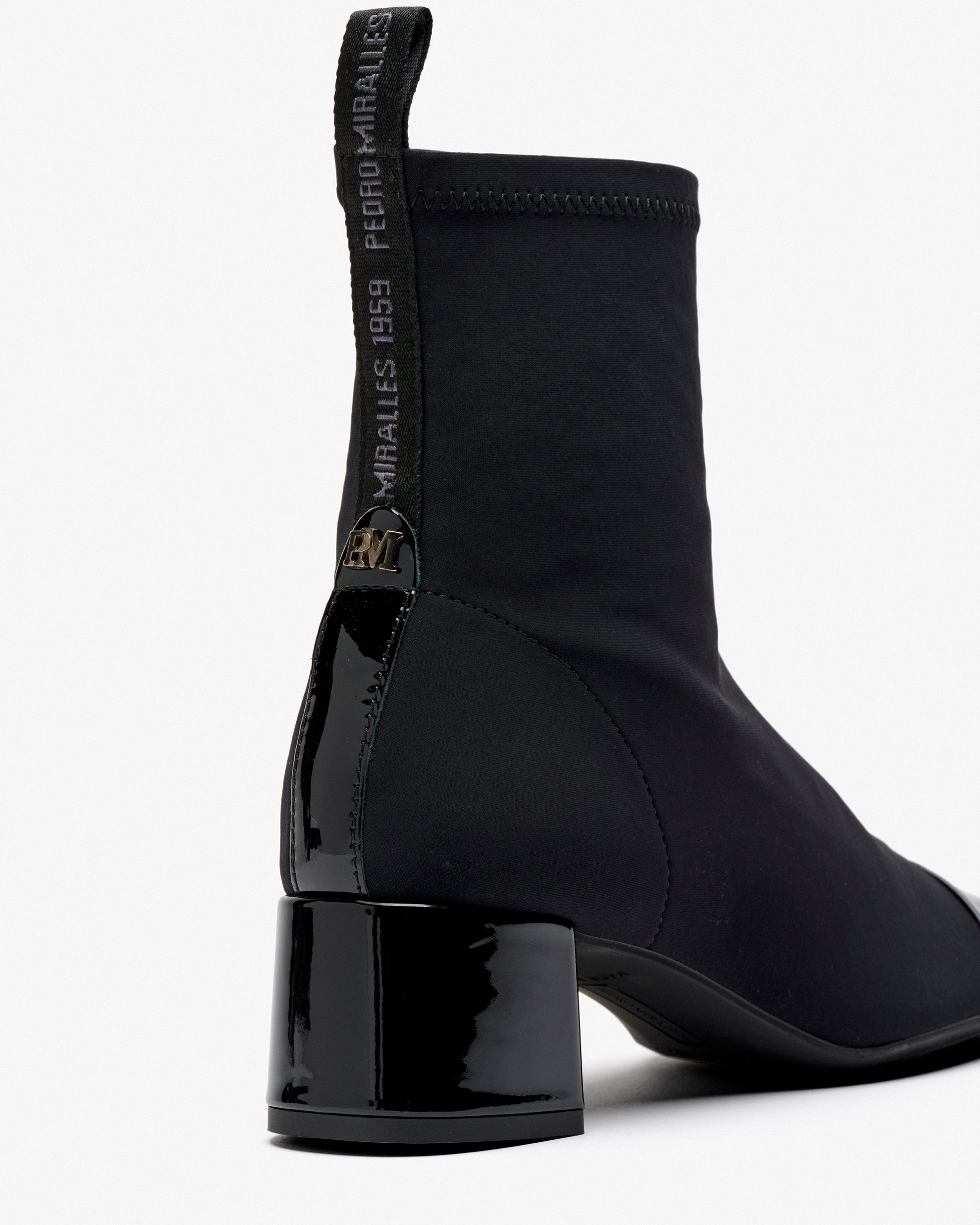 Des bottines à talon en tissu noir extensible. Si vous cherchez des chaussures originales, polyvalentes et de qualité, ce sont les bottines parfaites pour vous. Faites de ce modèle votre incontournable de la saison pour sublimer n’importe quel look.