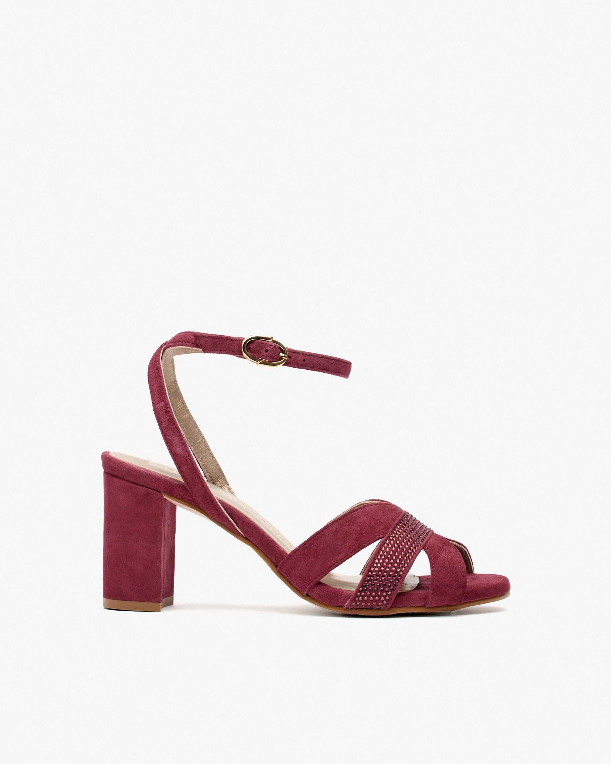 Sandales à talons en daim bordeaux à paillettes. Son design élégant met en valeur la silhouette tout en assurant un bon maintien, grâce à la lame. L’association du daim et du détail des paillettes rehausse la sophistication du modèle. Il est doté d’une bride croisée à la cheville pour favoriser l’ajustement et le mouvement du pied.