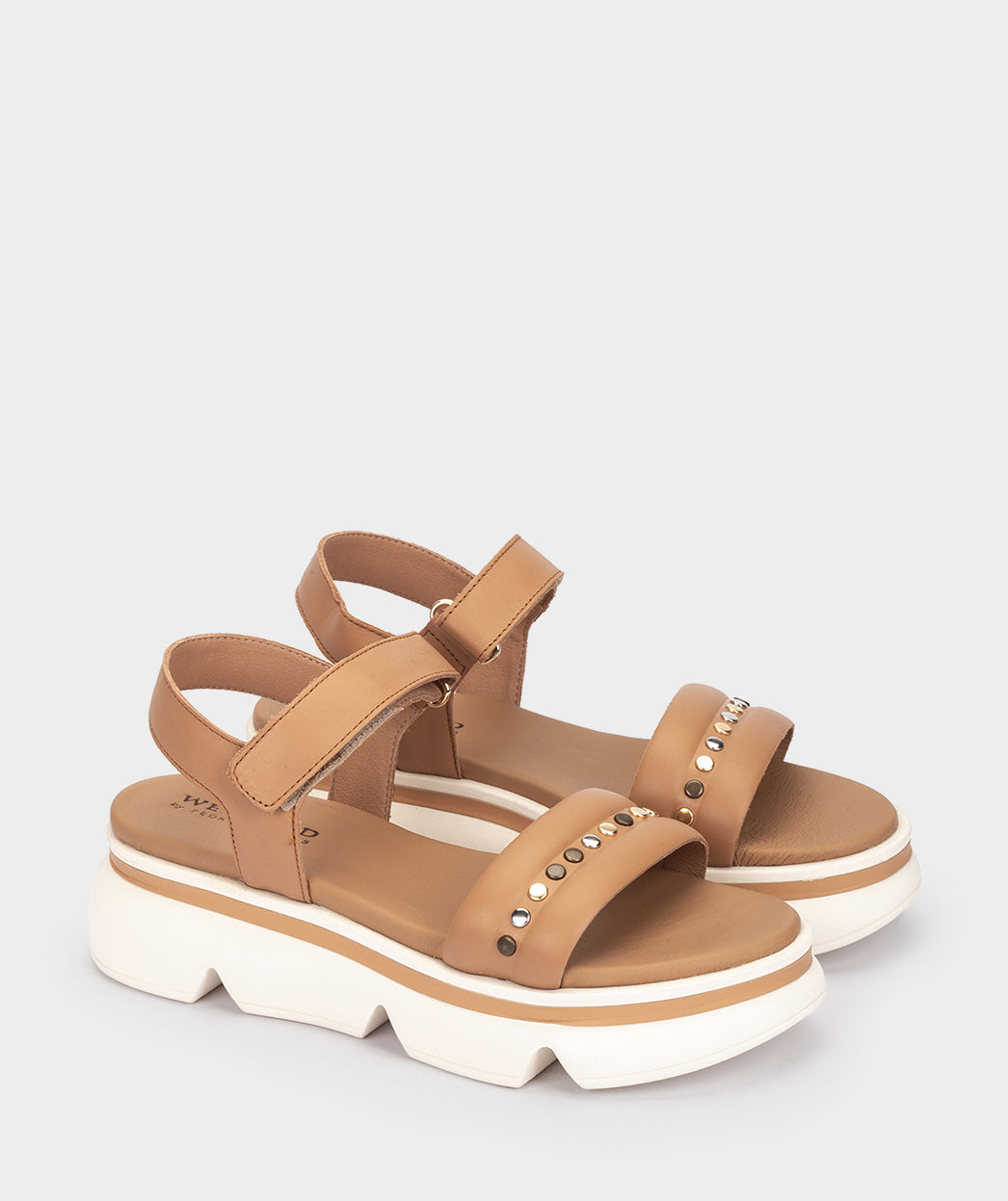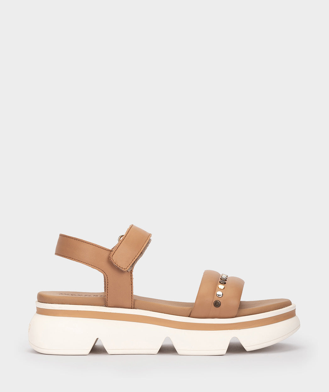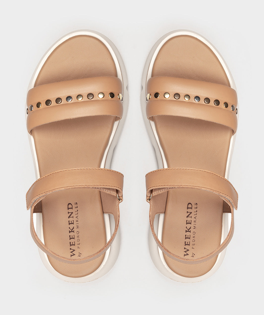 Sandalias planas de piel en color camel, confeccionadas con tachuelas en la pala. Te invitamos a probar estas sandalias y descubrir el equilibrio perfecto entre el estilo deportivo, el confort y la calidad que solo Pedro Miralles puede proporcionar.