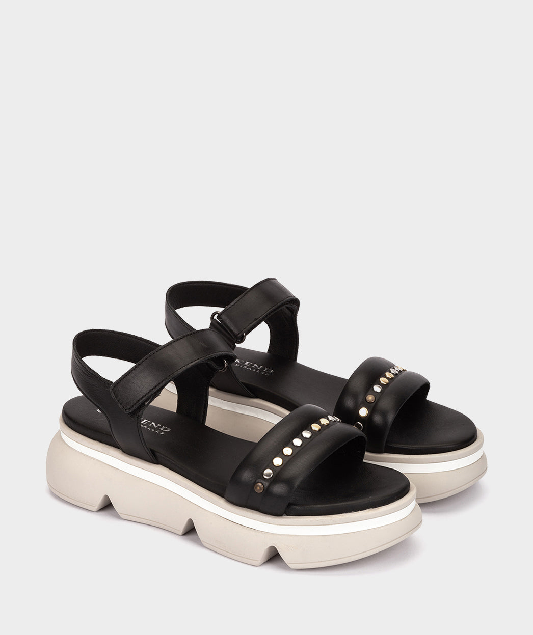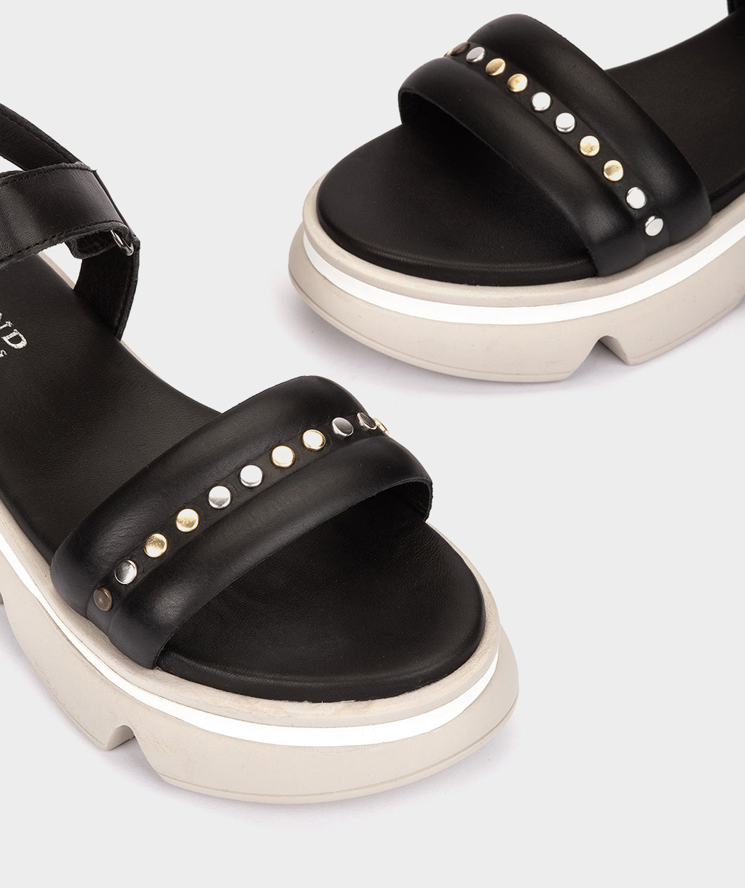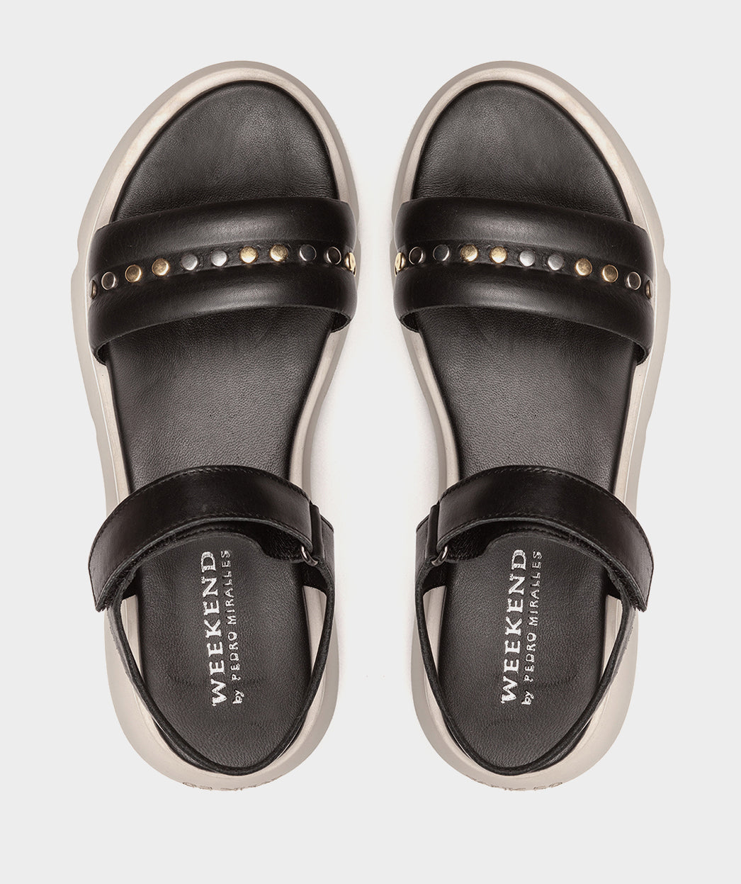 Sandalias planas de piel en color negro, confeccionadas con tachuelas en la pala. Te invitamos a probar estas sandalias y descubrir el equilibrio perfecto entre el estilo deportivo, el confort y la calidad que solo Pedro Miralles puede proporcionar.
