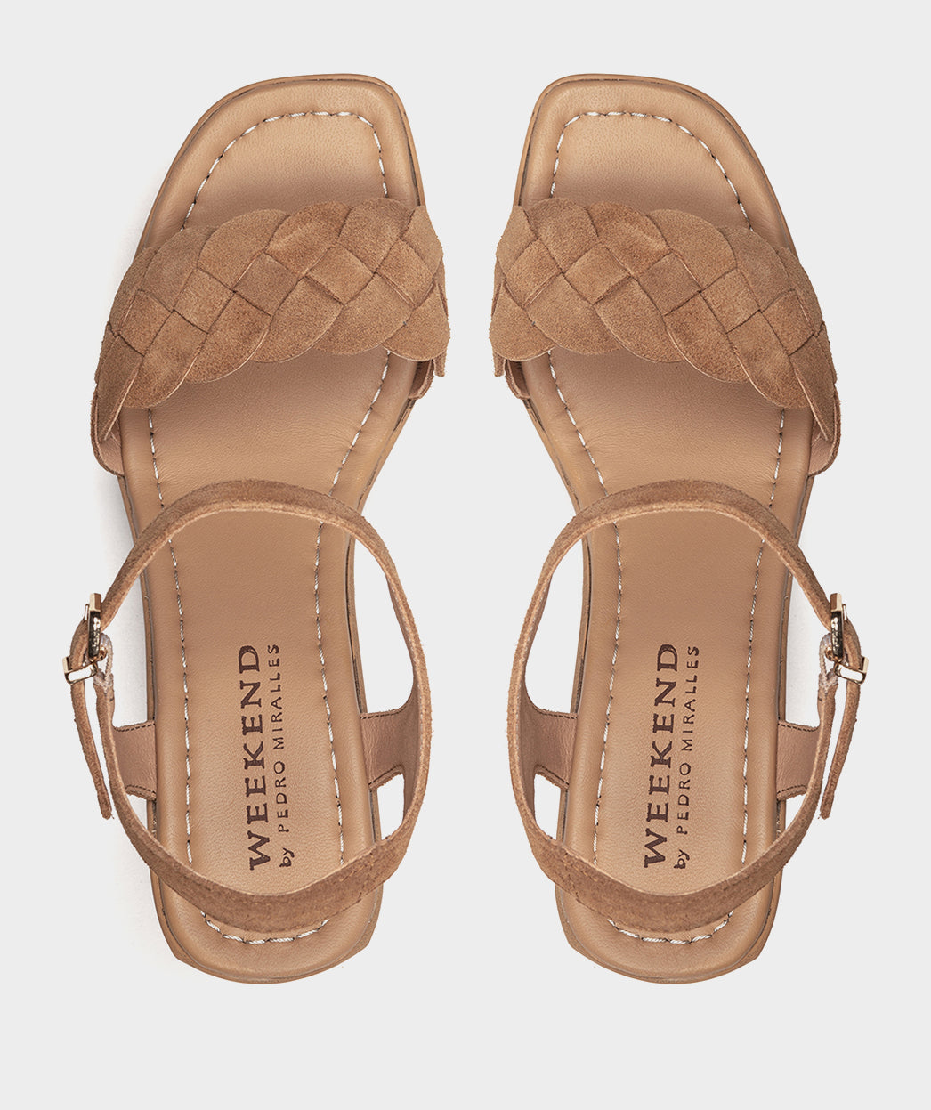 Sandalias de piel de serraje en color cuero. Confeccionadas con un tacón escultural de efecto madera y una pala trenzada que añaden un toque de elegancia a tus pies. Estas sandalias te transportarán a un mundo donde la moda se fusiona con el arte.