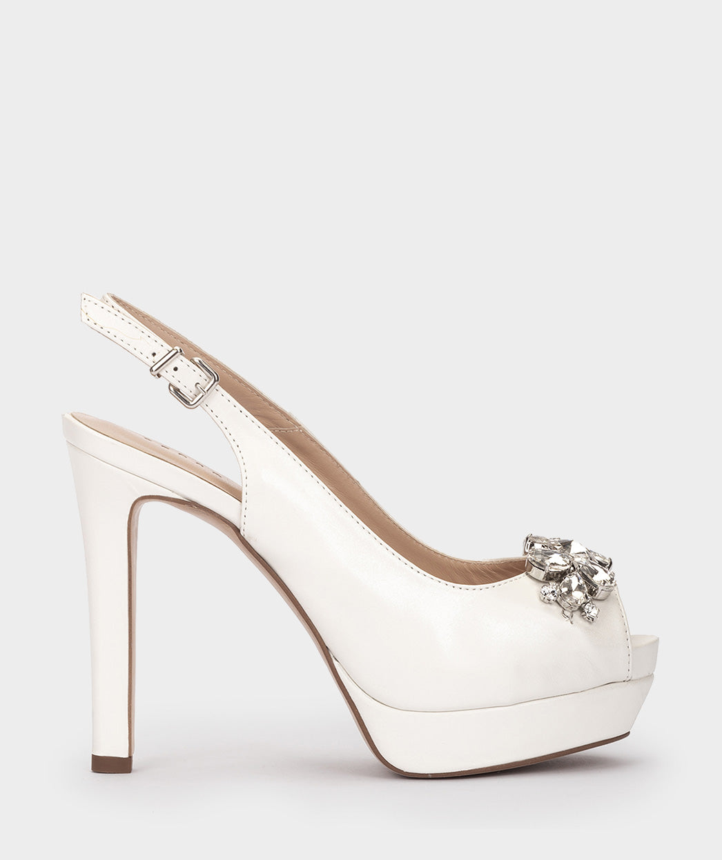 Sandalias de tacón de piel de color blanco nacarado. Confeccionadas con adorno de piedas sobre la pala y doble plataforma. Si lo que buscas es elegancia y altura sin renunciar a la comodidad, este es tu modelo ideal.