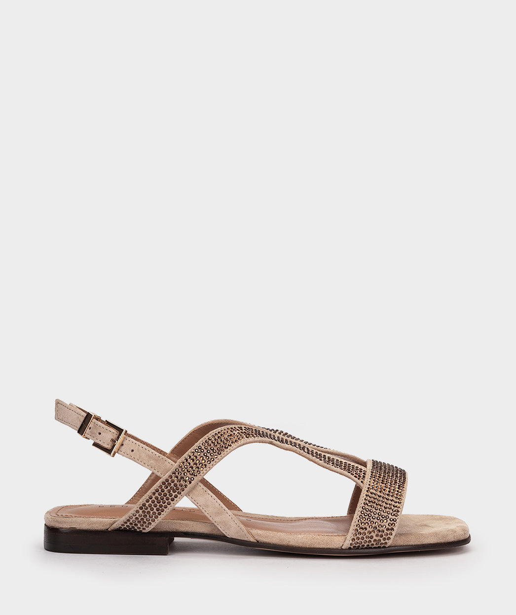 Sandalias planas de ante en color beige. Este modelo ha sido confeccionado con pequeñas piedras brillantes que añaden un toque de lujo a cada detalle de estas sandalias.