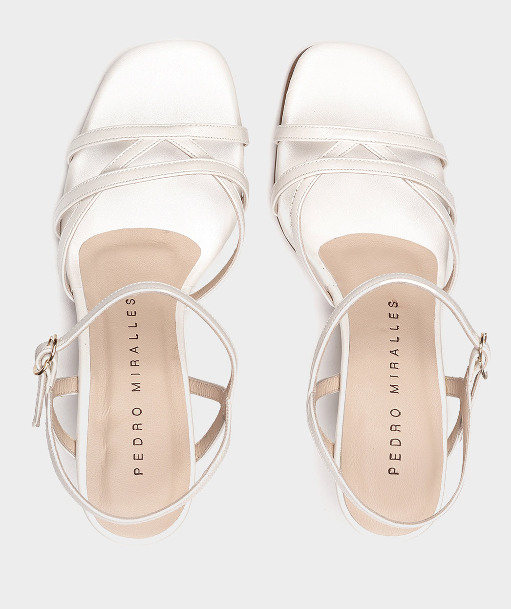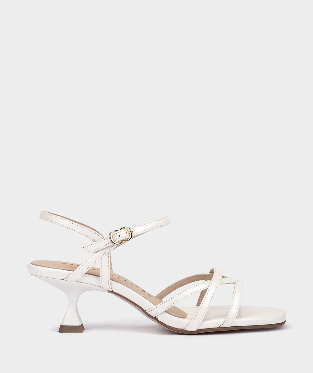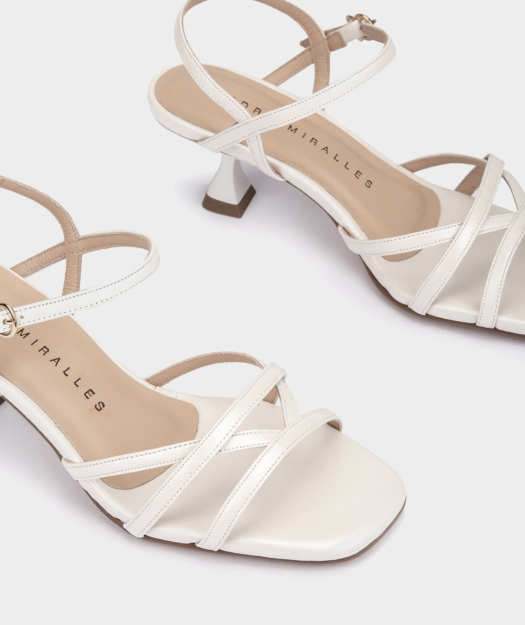 Sandalias de tacón de piel en color blanco. Sencillez y sofisticación definen el modelo ARUBA. Una opción pensada para quienes apuestan por el tacón bajo.