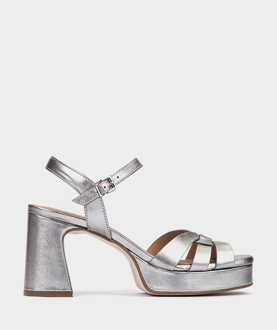 Sandalias de tacón ancho con plataforma fabricadas en piel metalizada de color acero. Consigue el calzado perfecto para tus looks de verano con las sandalias Verapaz.