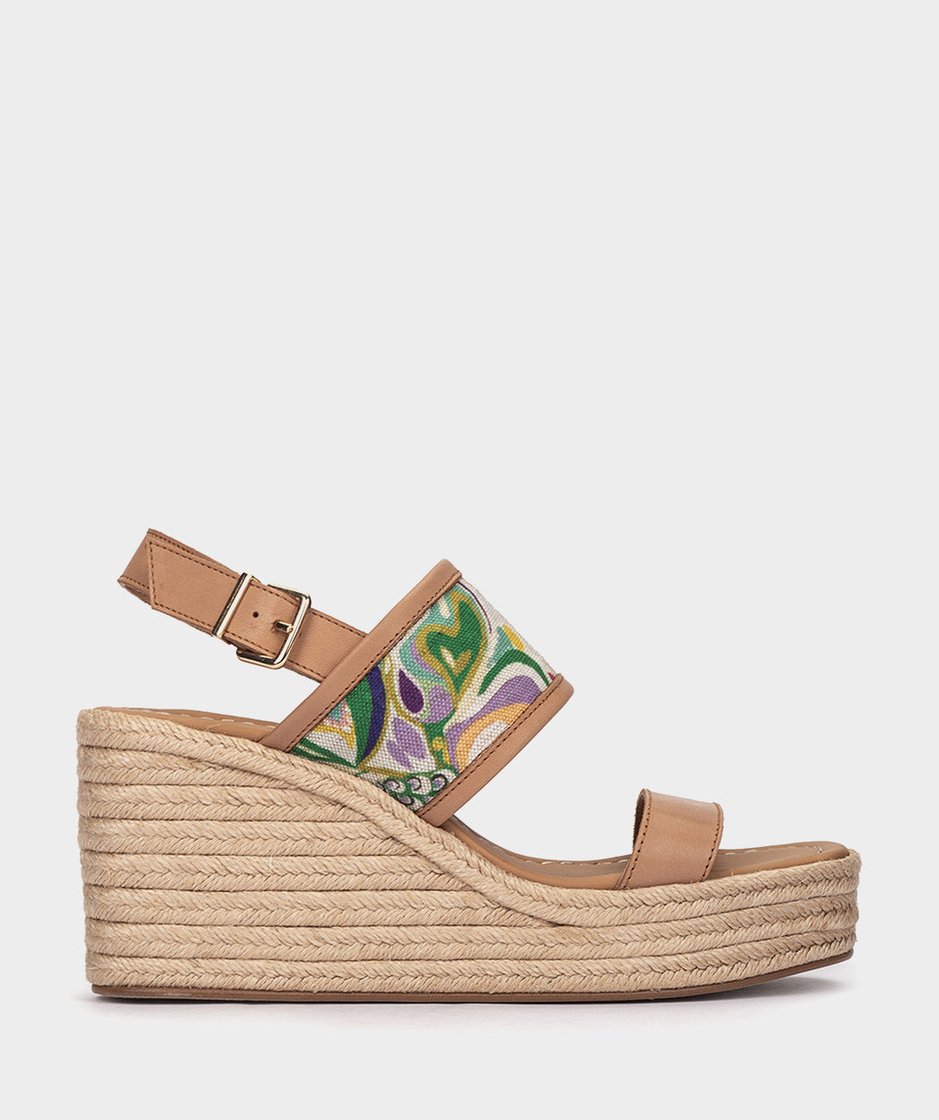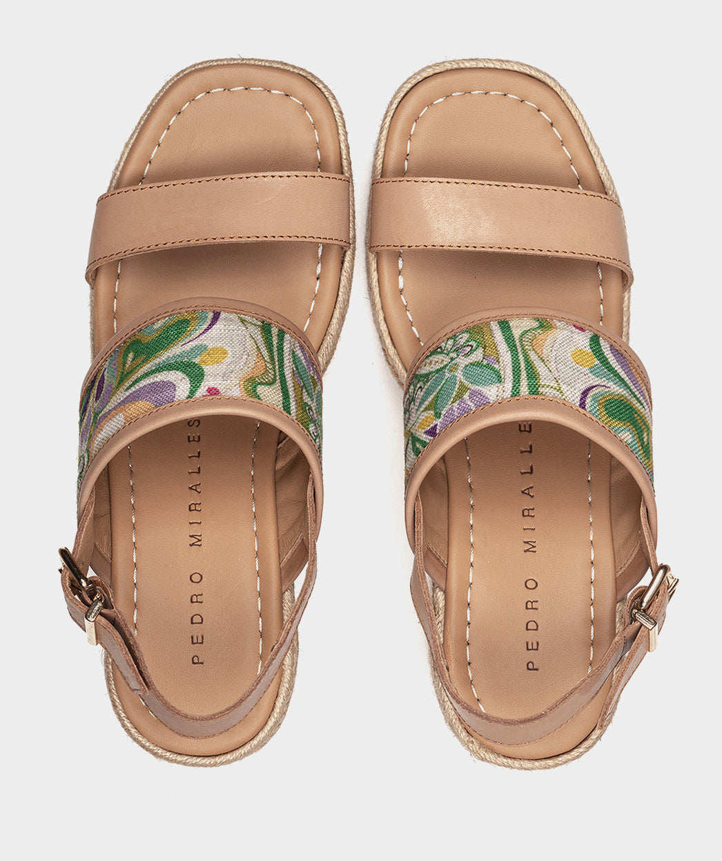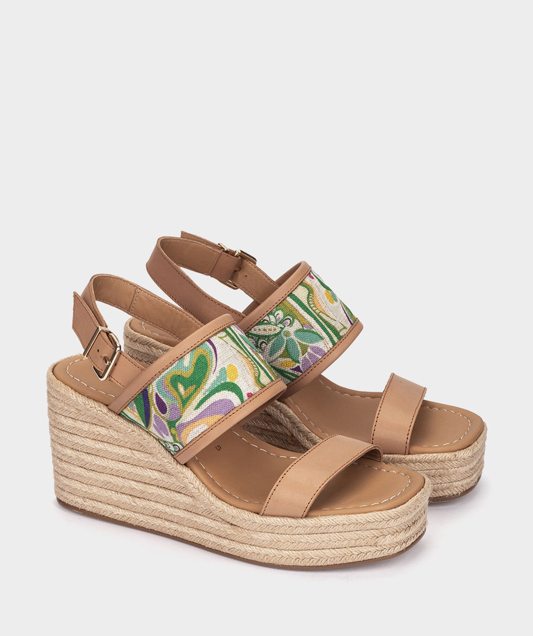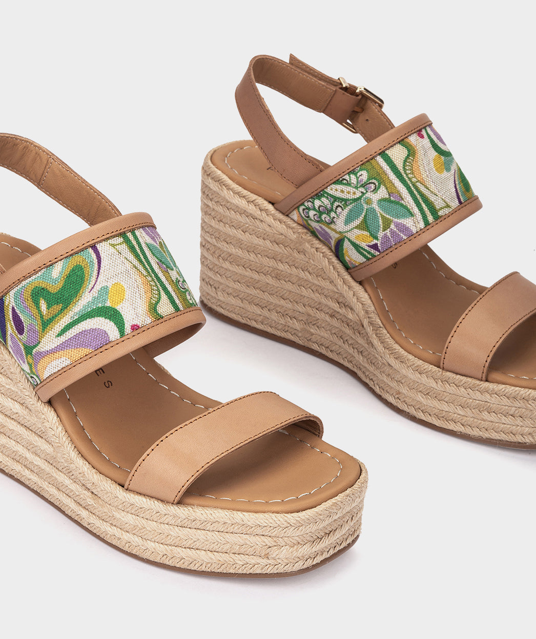 Cuñas con plataforma de piel y tejido. El tejido de fantasía forma patrones intrincados y detalles deslumbrantes que despierta los sentidos. Cada paso es una declaración de estilo con las alpargatas Ferragudo.