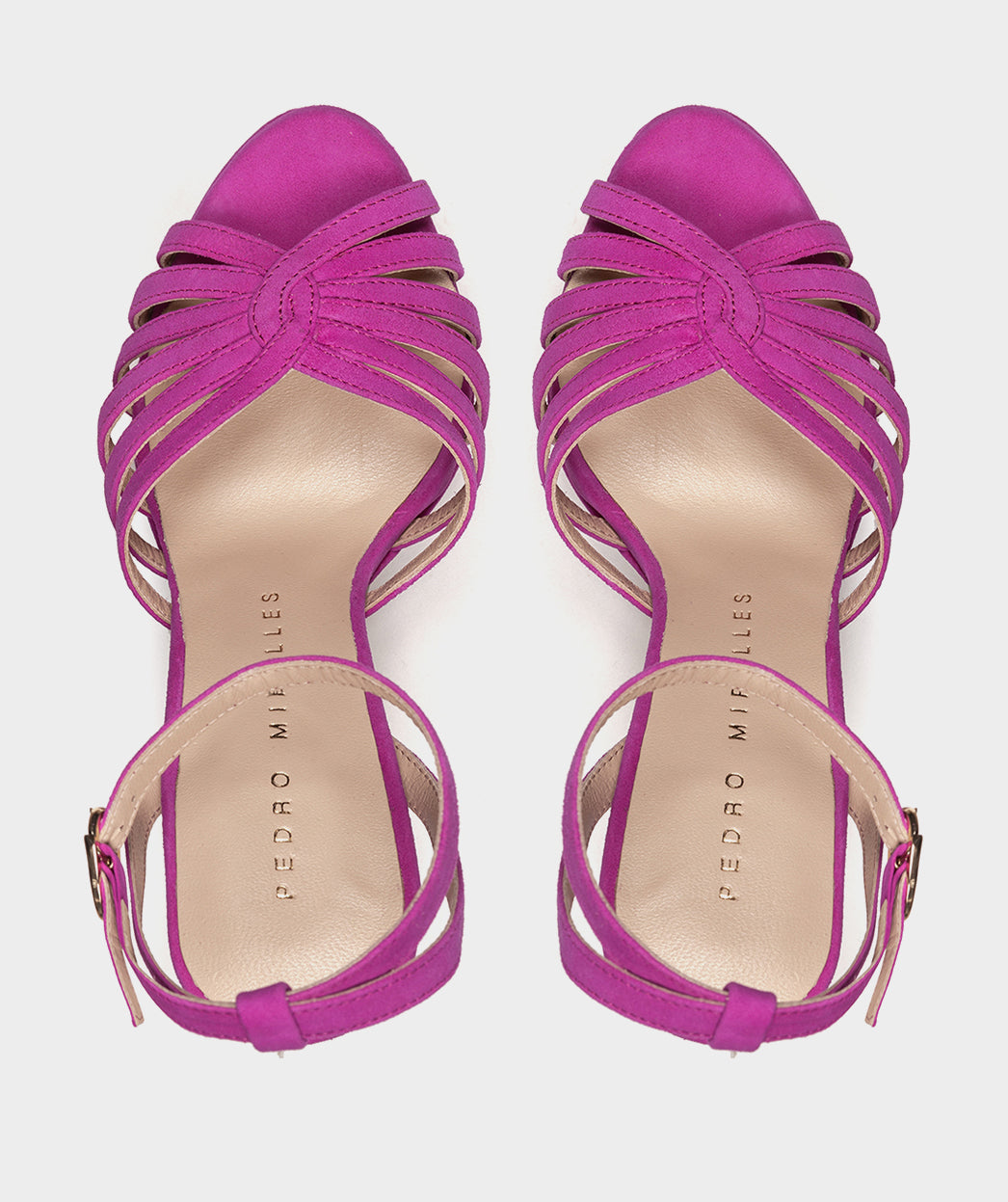 Sandalias de tacón con plataforma de ante en color buganvilla. El modelo Etiopia consigue realzar la silueta del pie gracias a la confección de la pala de tiras. Cierre de pulsera al tobillo. Un modelo original y elegante pensado para tus eventos más especiales.