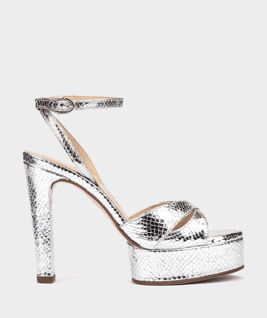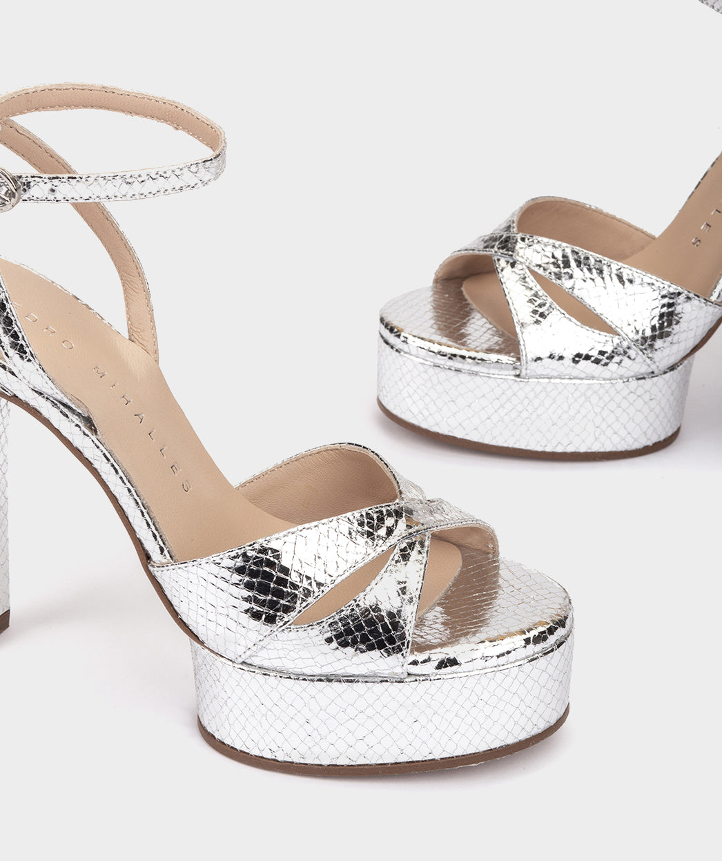 Sandalias de tacón con plataforma de piel grabada metalizada en color acero. Lleva contigo una combinación perfecta de comodidad y estilo que no pasa desapercibida.