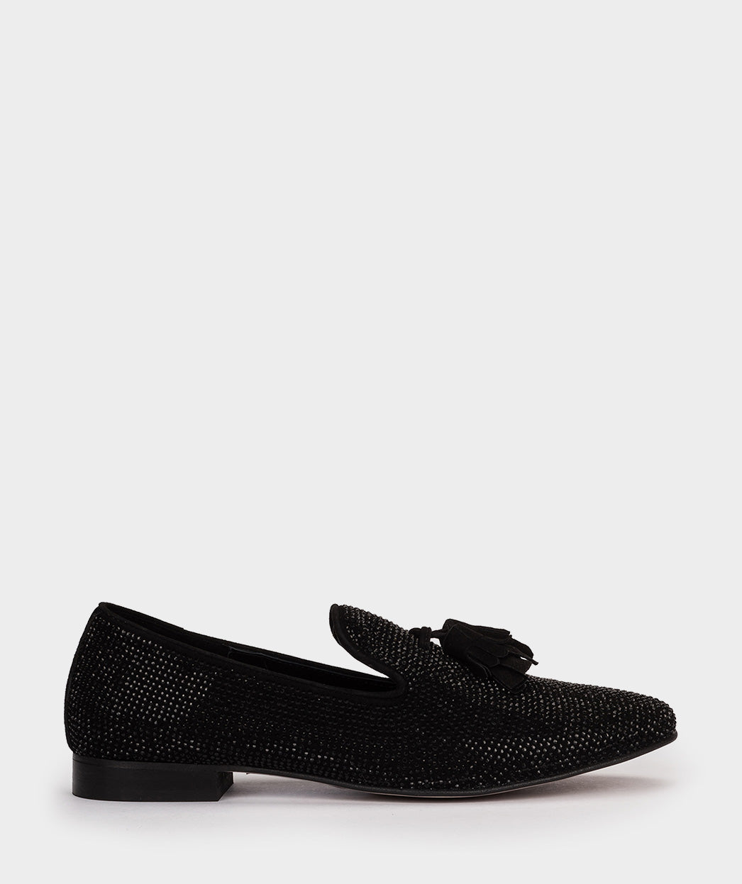 Mocasines negros con brillos y borlas. Un diseño clásico que con su silueta atemporal, se encuentra con la modernidad en esta interpretación única. El detalle de las borlas aporta originalidad al modelo.