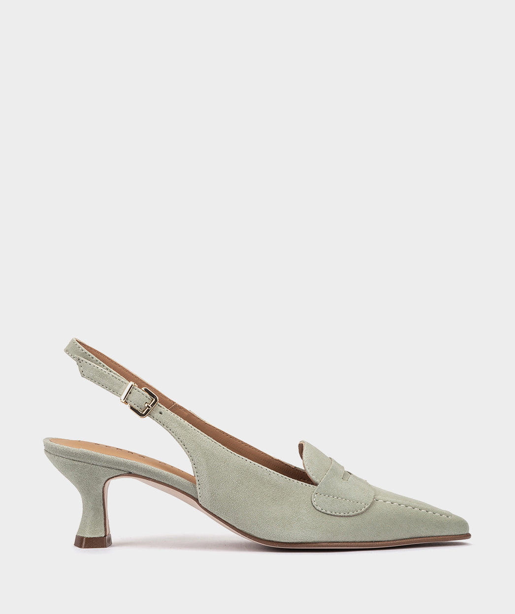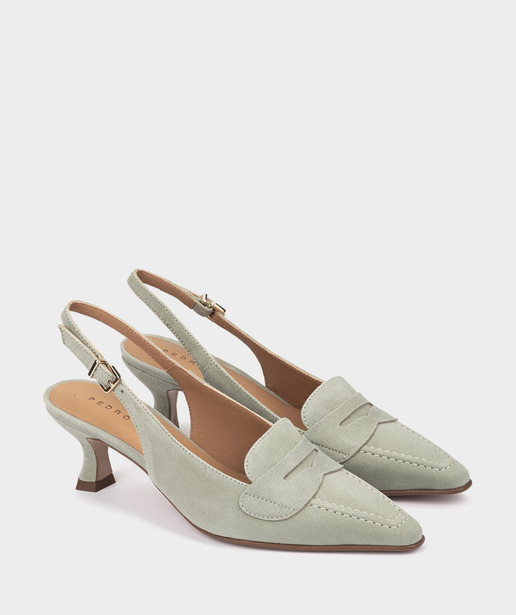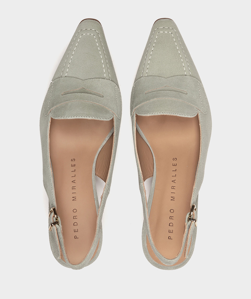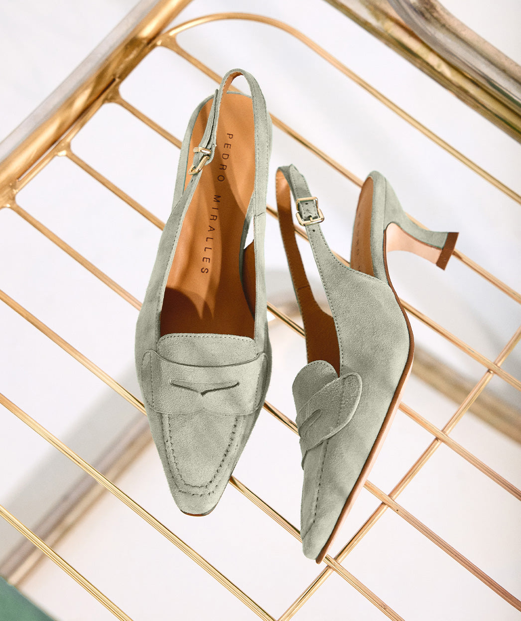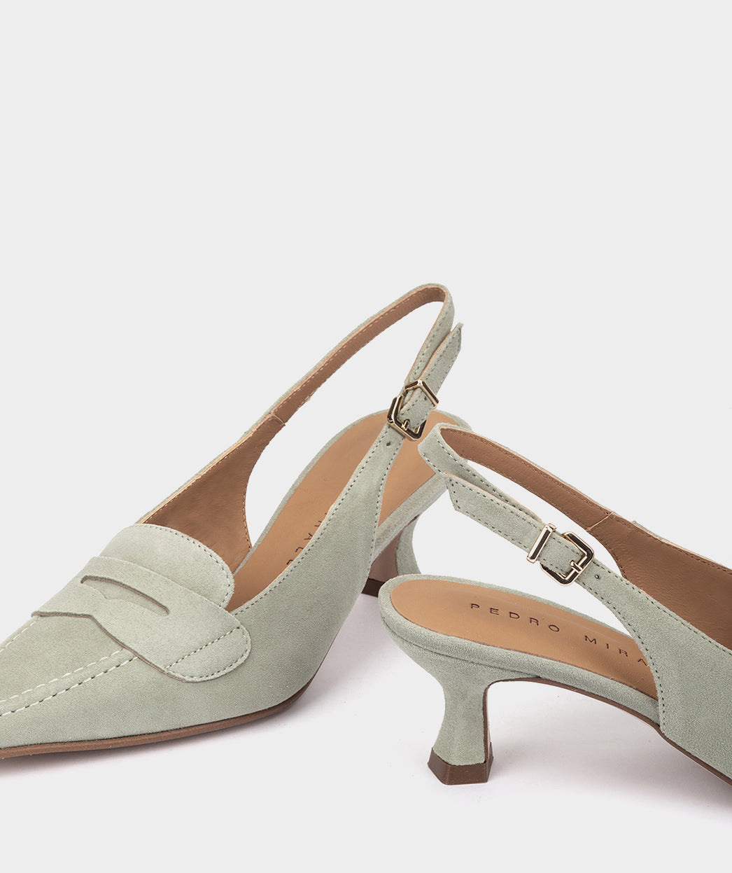 Zapatos destalonados de tacón bajo y punta fina hechos en ante de color verde. Diseño sofisticado en el que los detalles captan toda la atención. Destaca su adorno de antifaz colocado en el empeine que nos recuerda a la silueta de los mocasines.