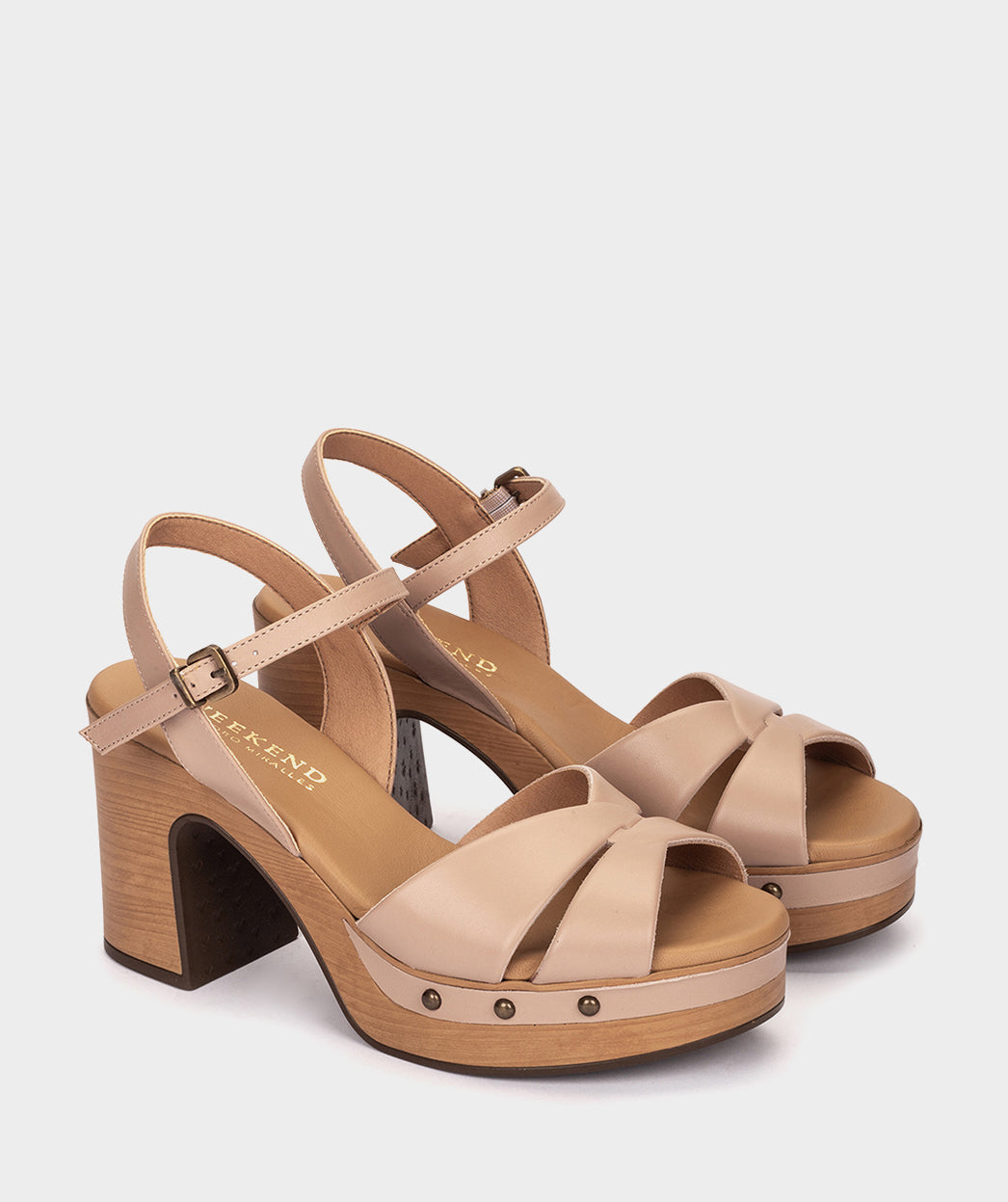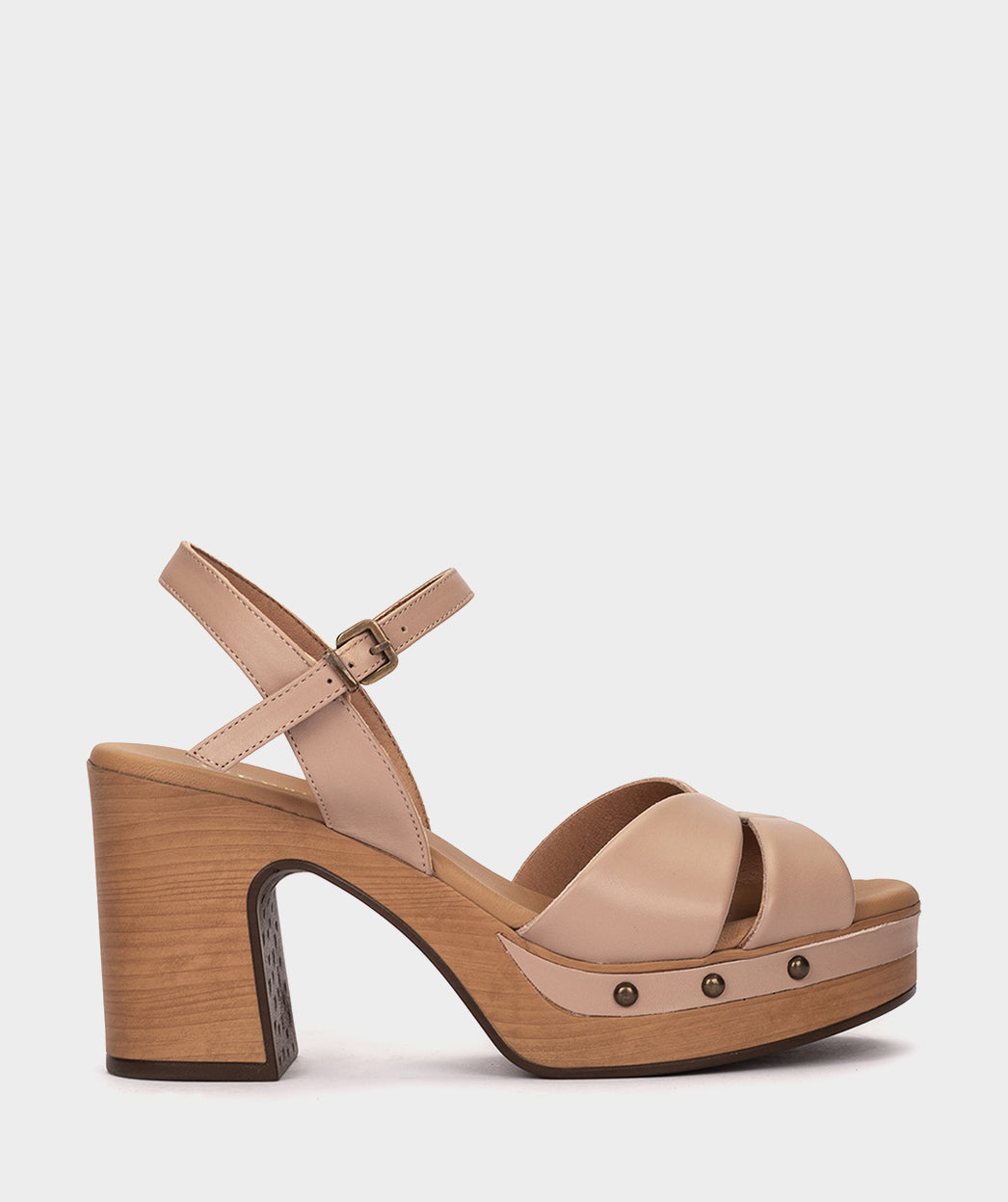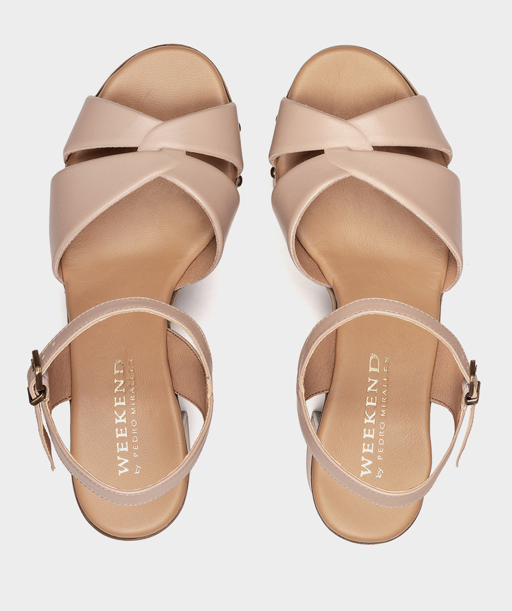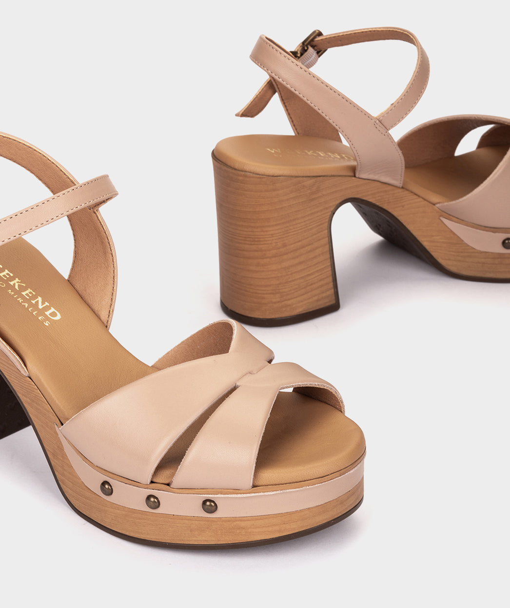 Sandalias de tacón de piel en color nude. Ideales para lucir cómoda sin perder el estilo. Estas sandalias se convertirán en el elemento básico de tu armario de verano.