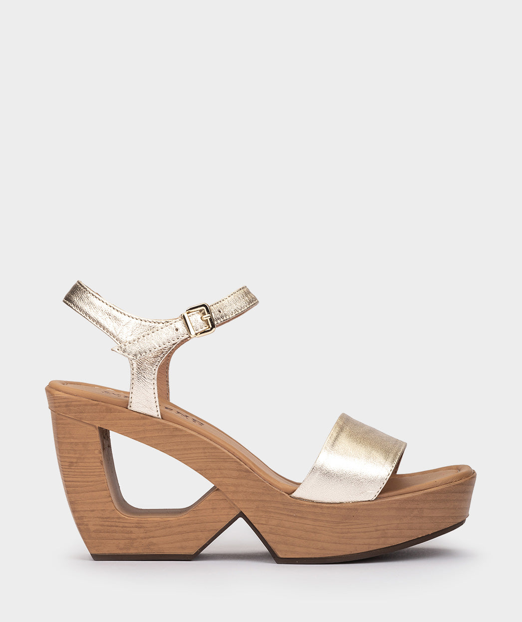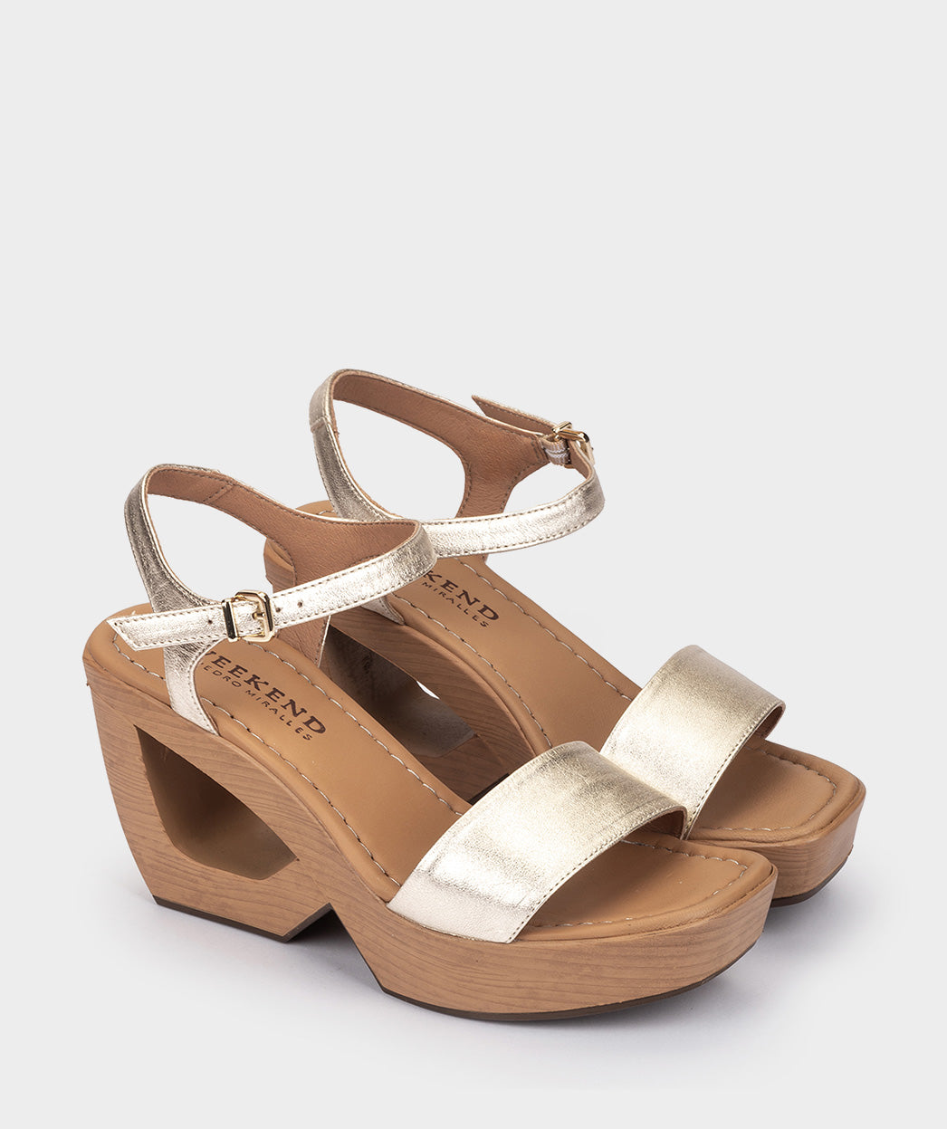 Sandalias de piel metalizada de color platino. Confeccionadas con un tacón escultural de efecto madera y una pala sencilla que añaden un toque de elegancia a tus pies. Estas sandalias te transportarán a un mundo donde la moda se fusiona con el arte.