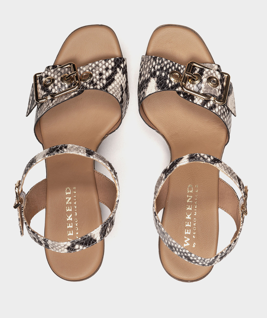 Sandalias de tacón de piel efecto serpiente. El modelo RUCANDIO apuesta por un diseño original y lleno de personalidad. Unas sandalias con personalidad propia con las que lucirás perfecta cualquier look.