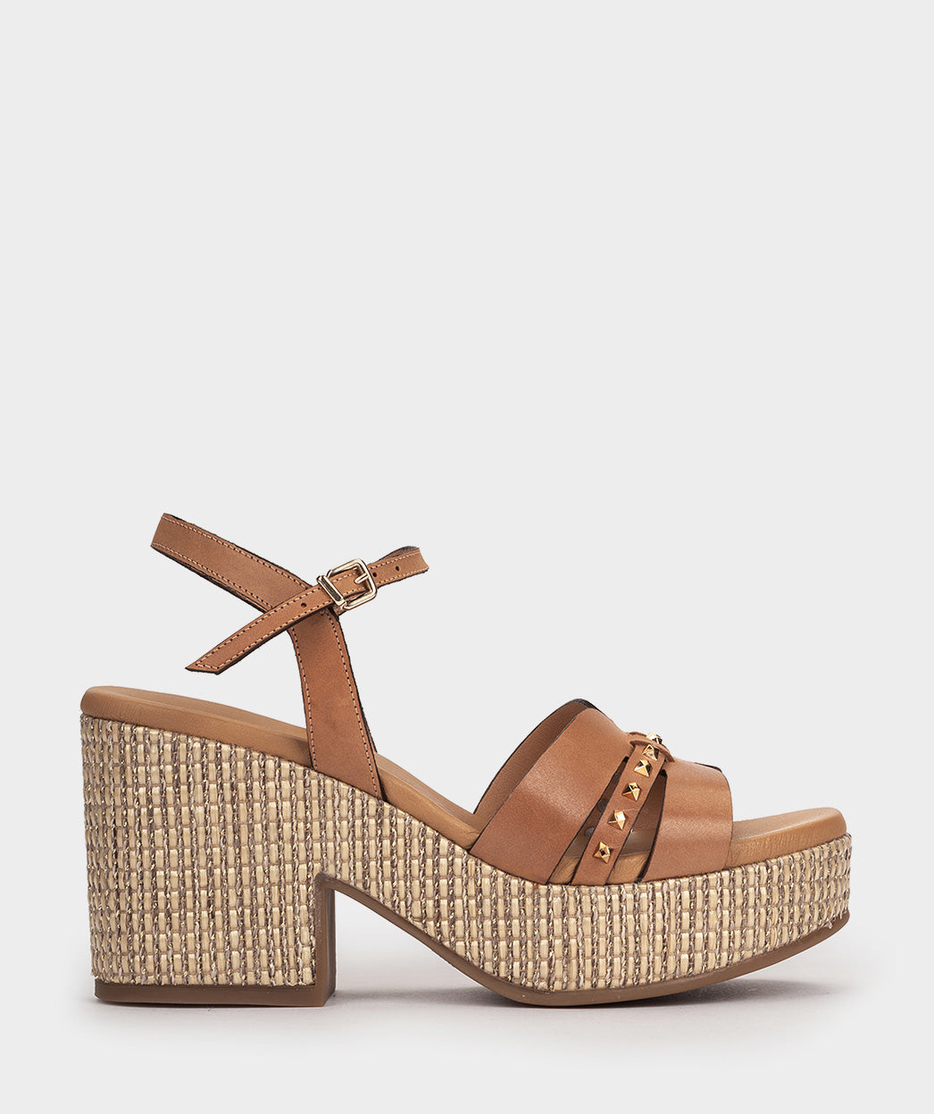 Sandalias de tacón de piel de color marrón. Un modelo que destaca por su comodidad y por su estética veraniega. La combinación de la rafia con las tachas eleva la originalidad del modelo. La plataforma y el tacón grueso ofrecen una mayor comodidad sin renunciar a la altura.