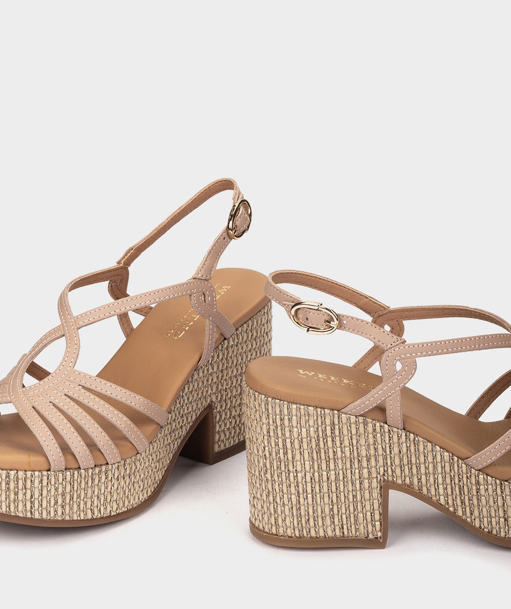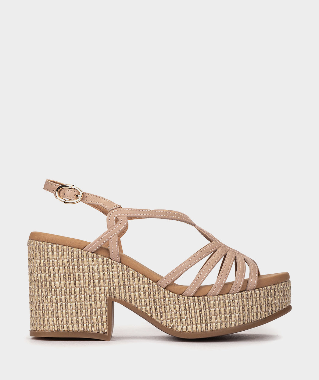 Sandalias de piel de color nude con plataforma de rafia. Un modelo tan atrevido como original. Diseñadas para lucirlas con comodidad en citas y eventos especiales. La plataforma cuenta con un efecto brillo que eleva su sofisticación.