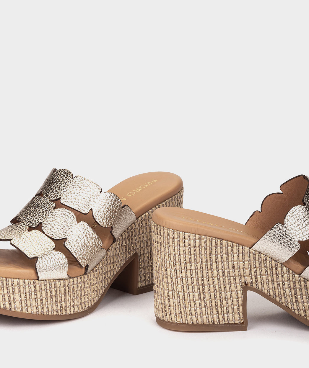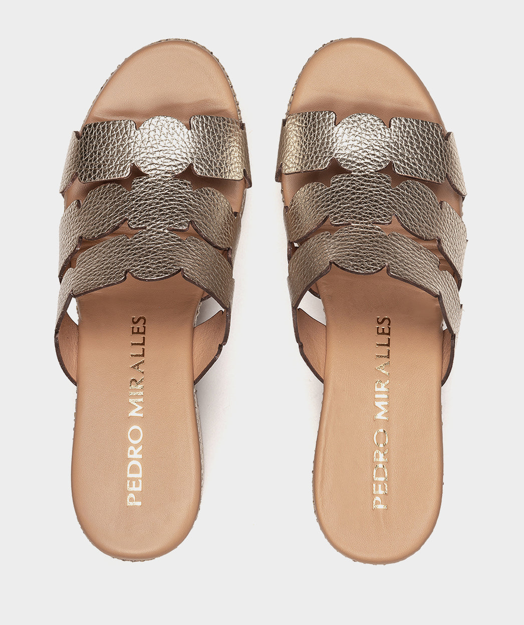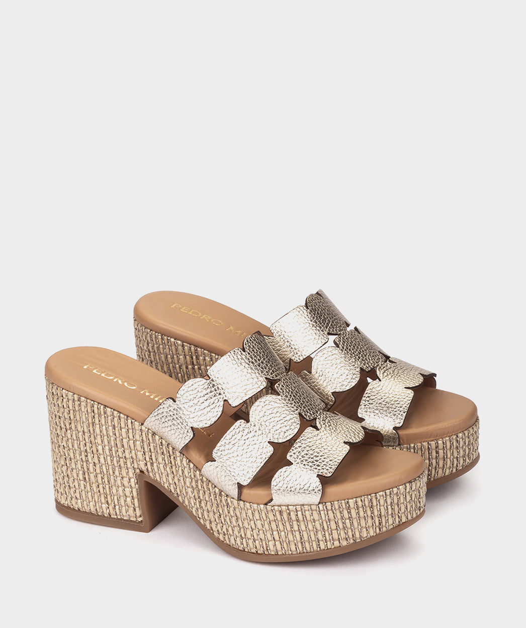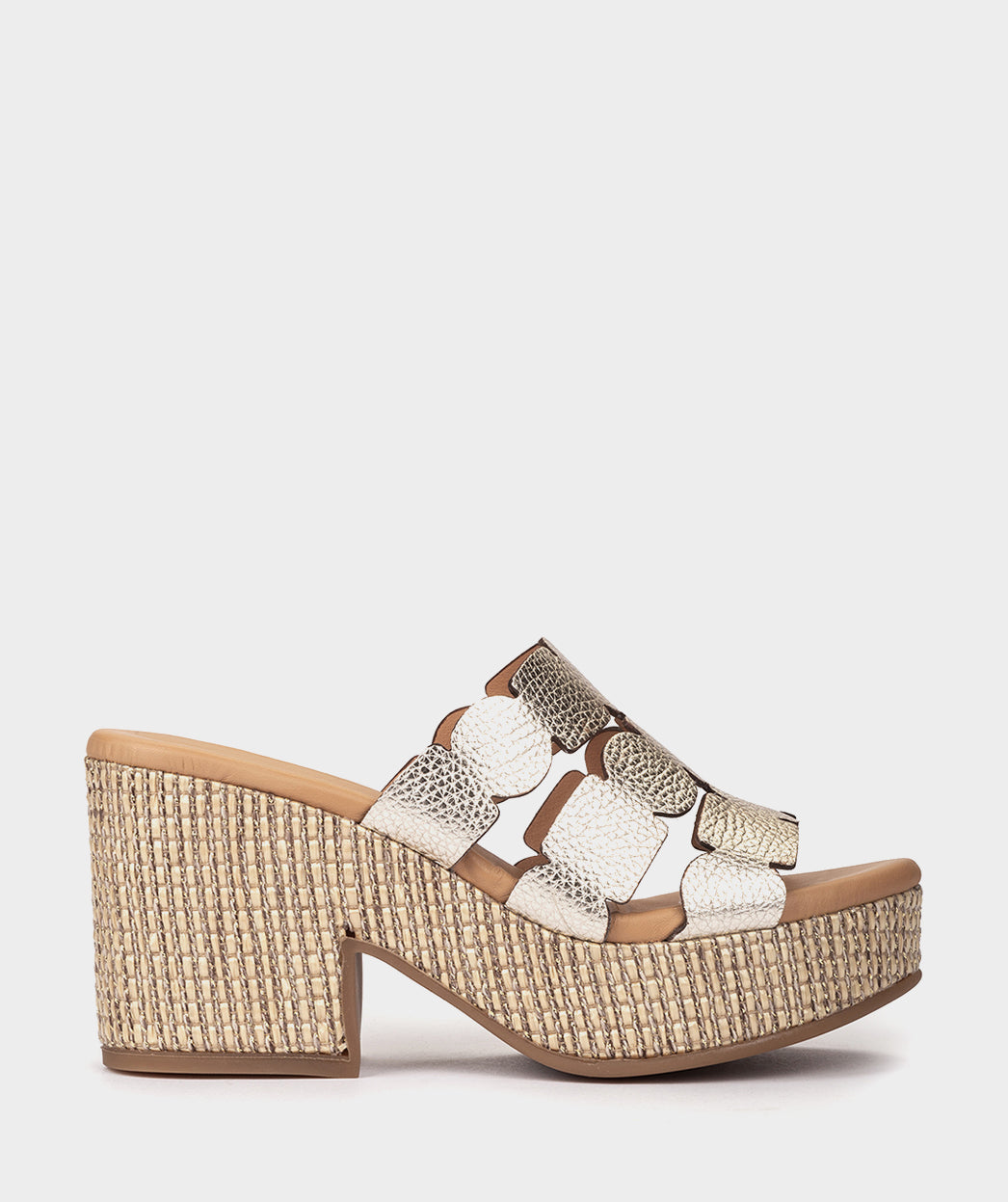 Sandalias de piel metalizada de color platino con tacón de rafia. Un diseño de estética mediterránea que resulta perfecto para las noches de verano. Si silueta combina diferentes figuras geométricas aportándole personaldiad propia al modelo.