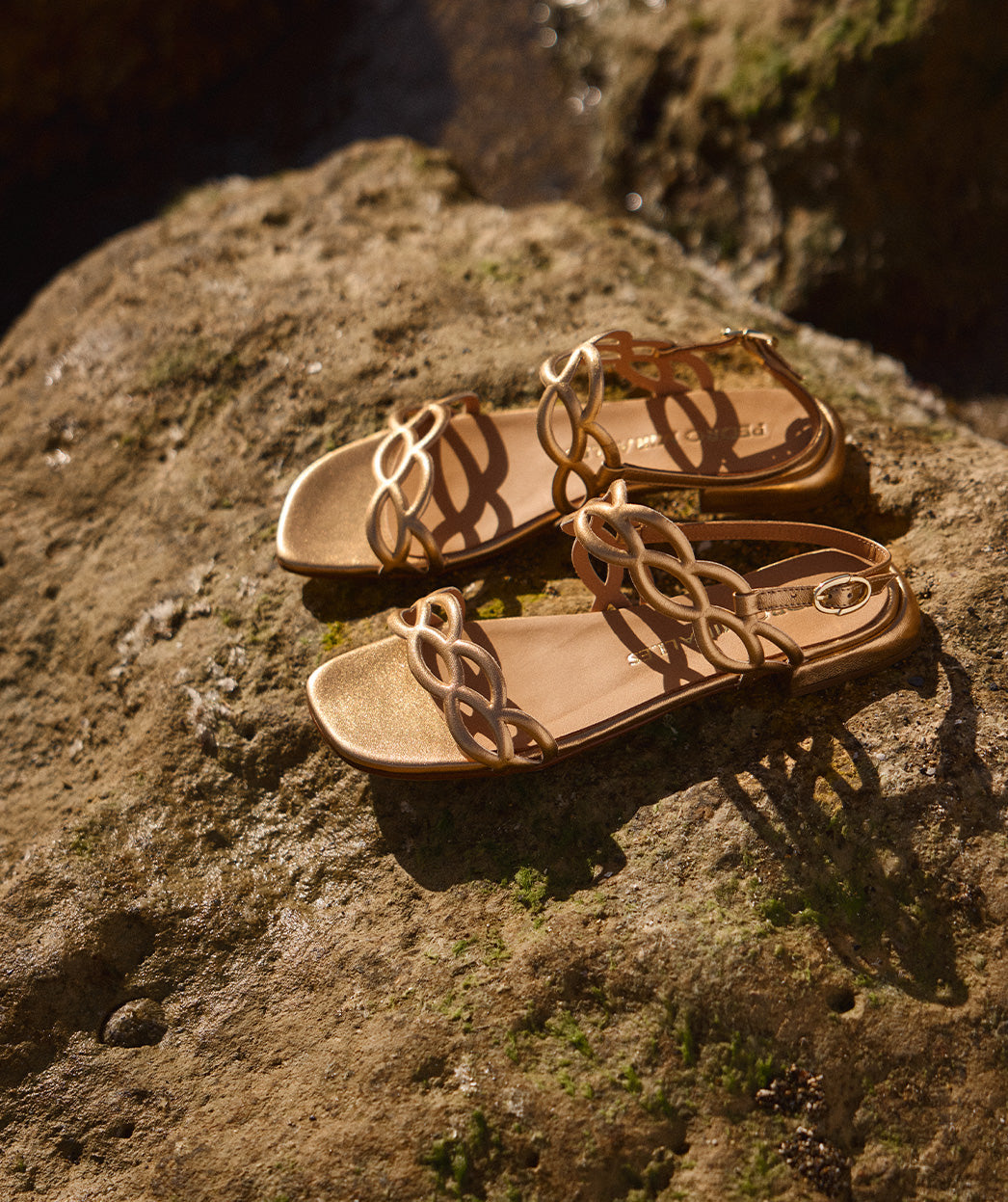 Sandalias planas de piel metalizada en color oro. Un clásico que no olvidamos, las sandalias romanas con tachuelas.Una elección perfecta para ir a la moda sin perder la comodidad que buscas. ¡Lúcelas como más te guste este verano!