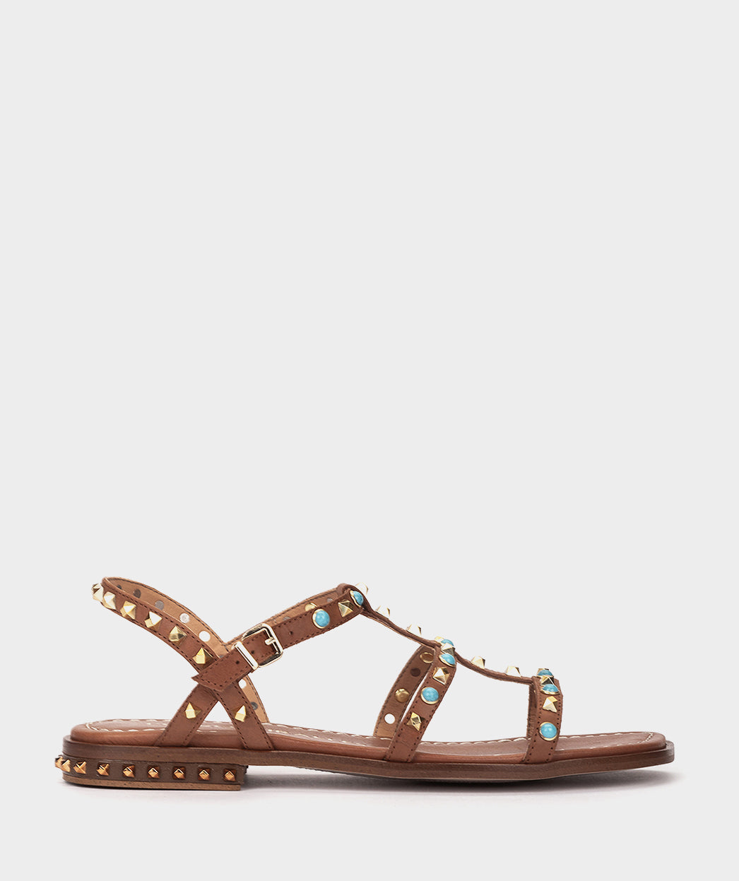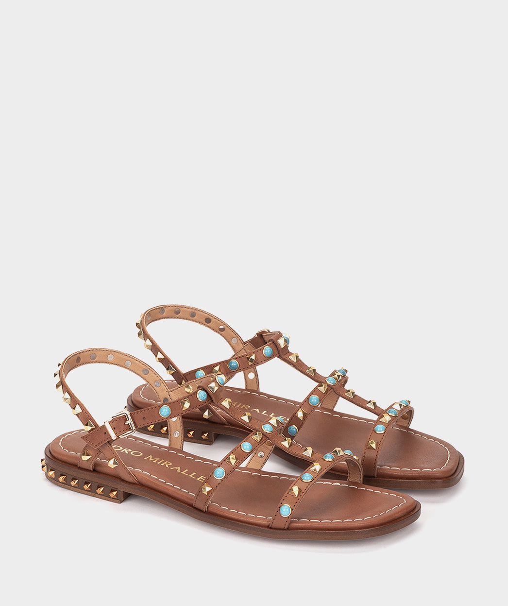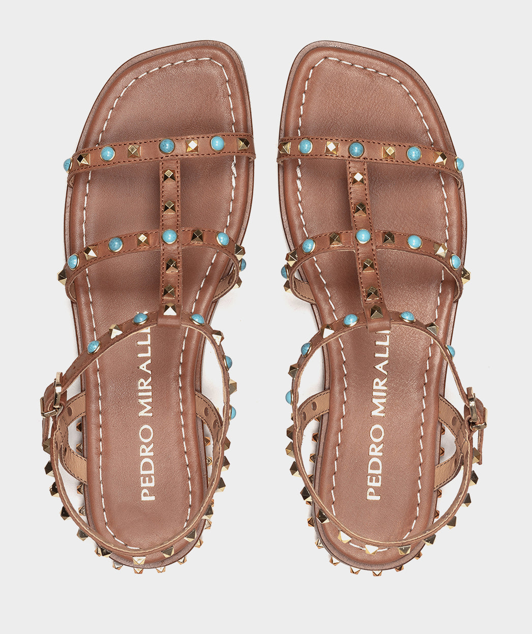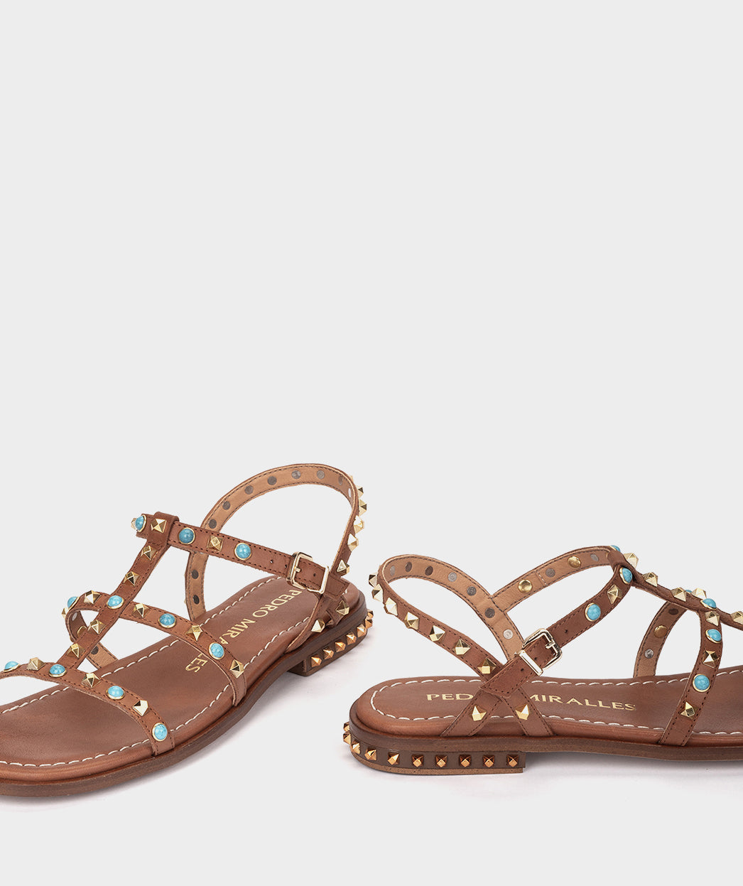 Sandalias planas de piel en color marrón. Un clásico que no olvidamos, las sandalias romanas con tachuelas.Una elección perfecta para ir a la moda sin perder la comodidad que buscas. ¡Lúcelas como más te guste este verano!