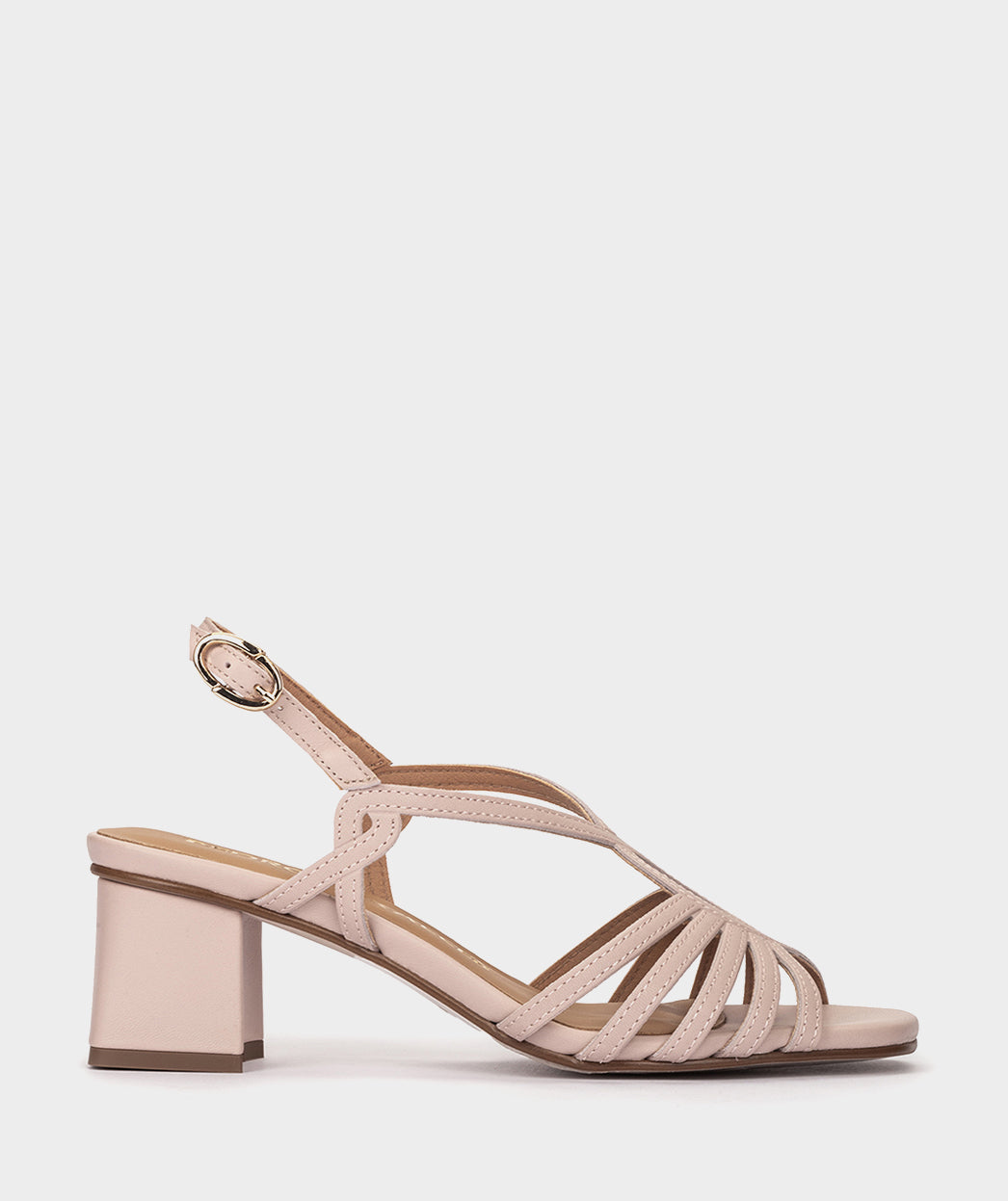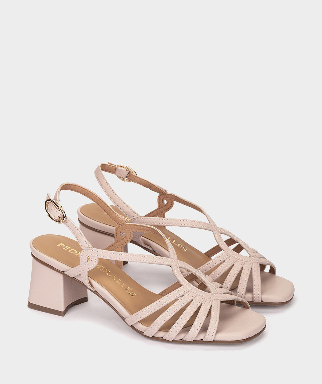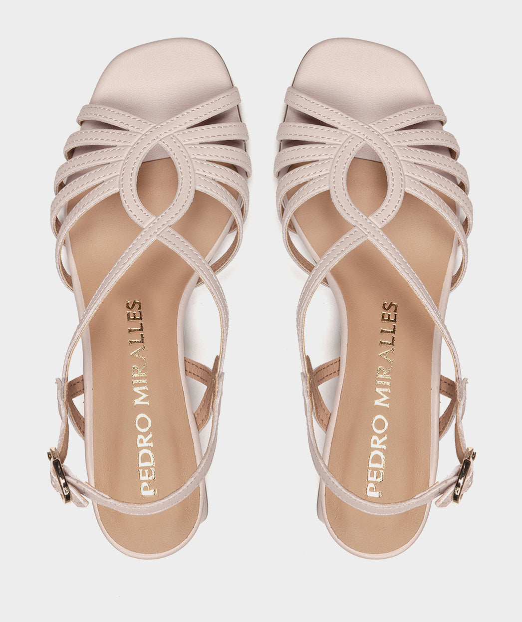 Sandalias de tacón de piel metalizada de color rosa. Las sandalias diseñadas para lucir en cualquier ocasión, gracias a su versatilidad. Un modelo que destaca por su silueta, cuyo empeine destaca por su figura que combina tiras y un óvalo central.