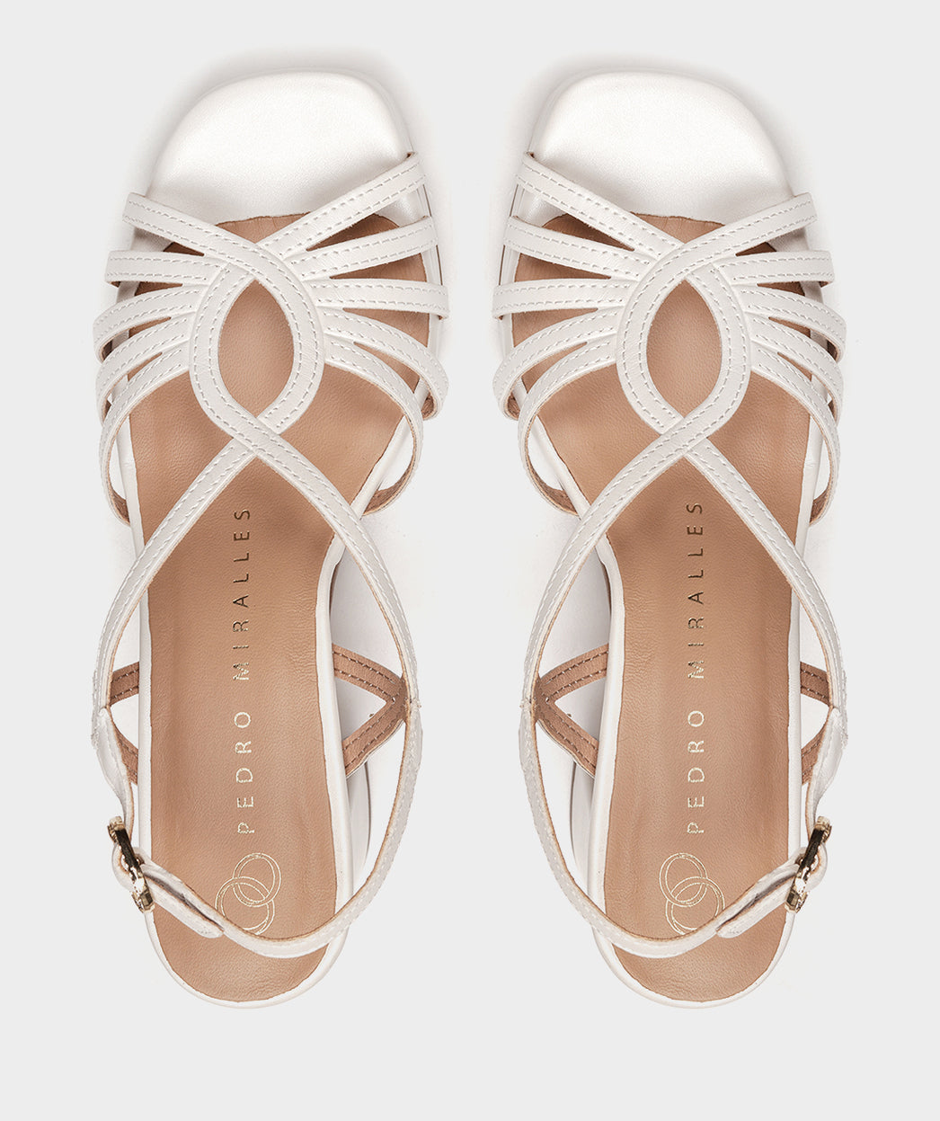 Sandalias de tacón de piel metalizada en color nacarado perla. Un diseño muy especial gracias a los detalles de sus tiras cruzadas y la forma ovalada en el empeine. El modelo PUZOL es la opción perfecta para cualquier evento.