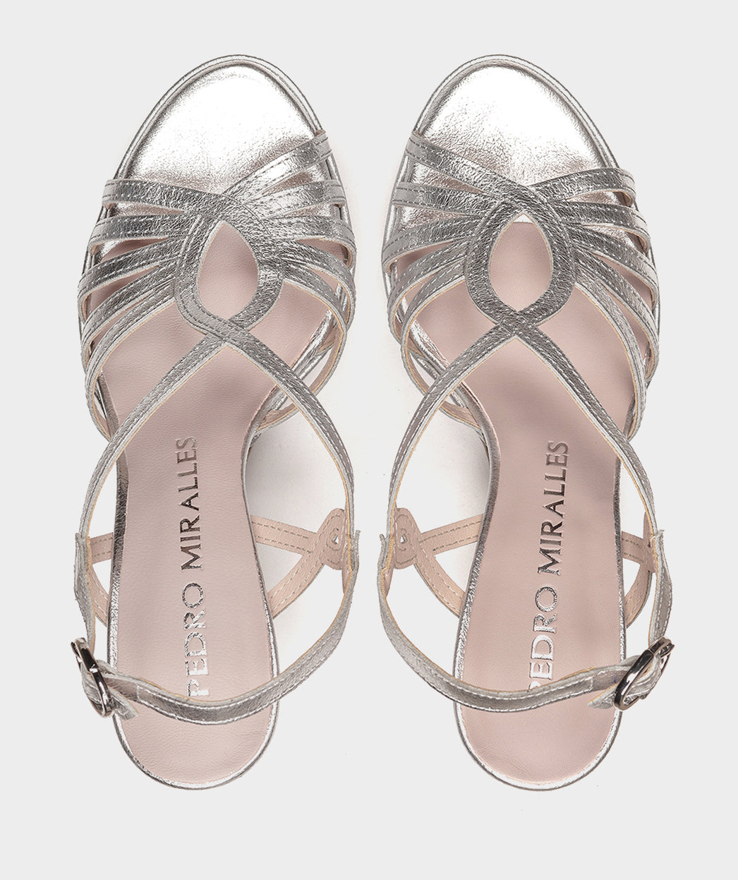 Sandalias de tacón de piel metalizada en color plata. Este modelo tan versátil, consigue sacar el maximo partido a la silueta del pie, aportando elegancia y estilo gracias a la confeccion de la pala de tiras.Pensado para los eventos más especiales. /p>