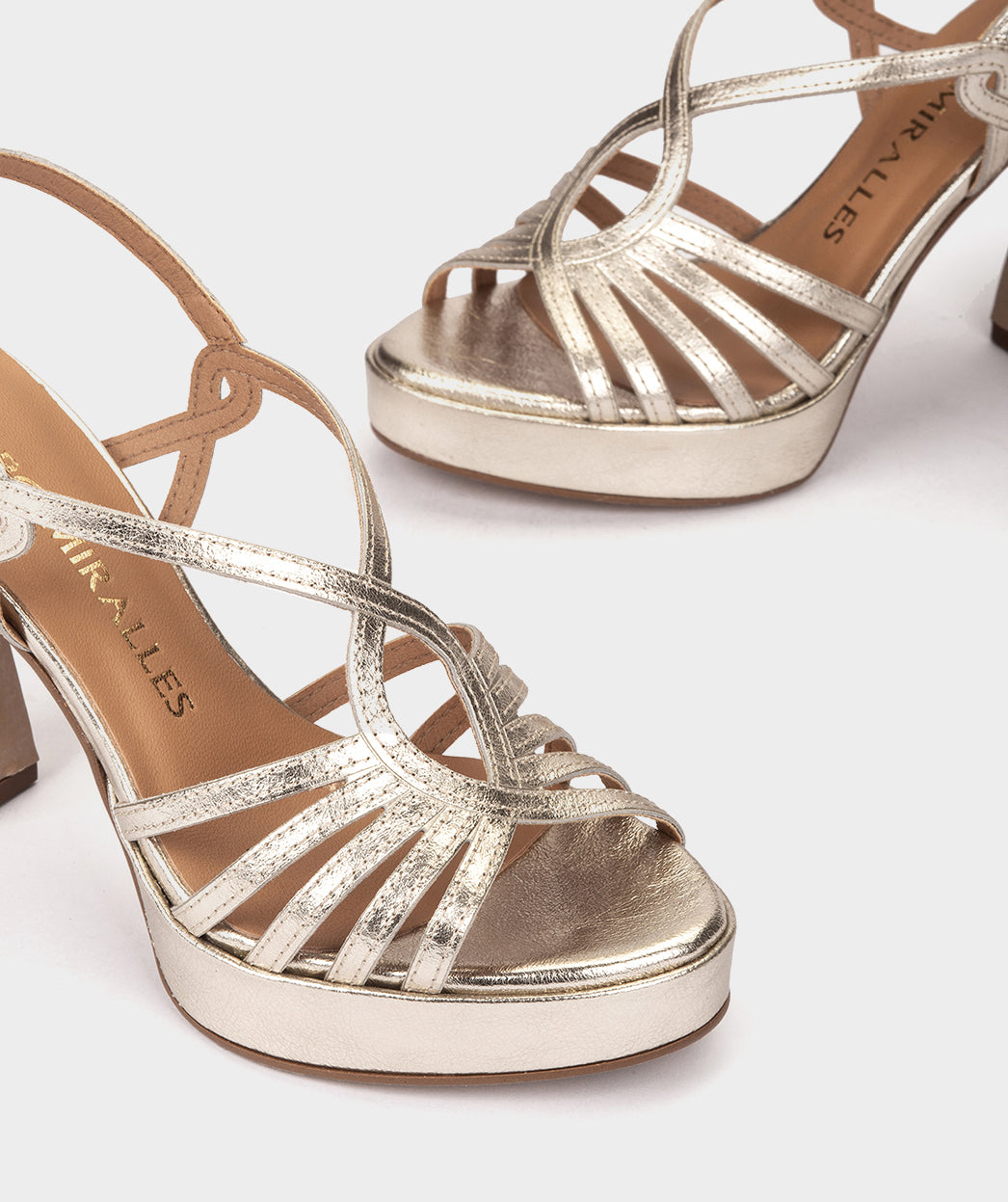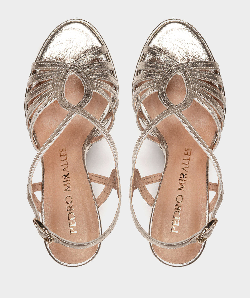 Sandalias de tacón de piel metalizada en color platino.Este modelo tan versátil, consigue sacar el maximo partido a la silueta del pie, aportando elegancia y estilo gracias a la confeccion de la pala de tiras.Pensado para los eventos más especiales. /p>