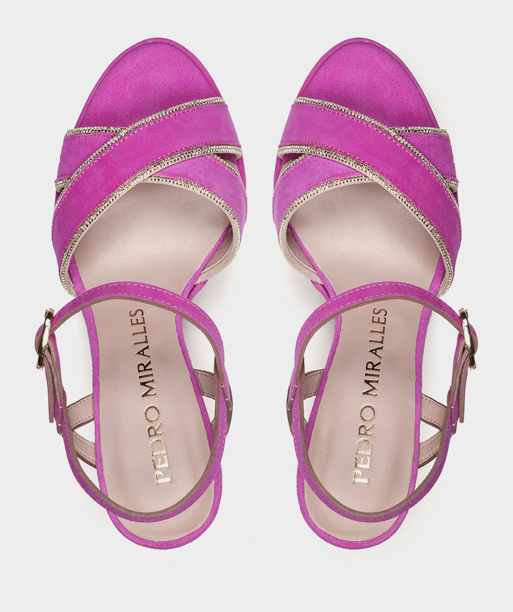 Sandalias de tacón de ante de color buganvilla con brillos. Serás la invitada perfecta con este modelo, que destaca por los brillos colocados cuidadosamente en la pala cruzada.
