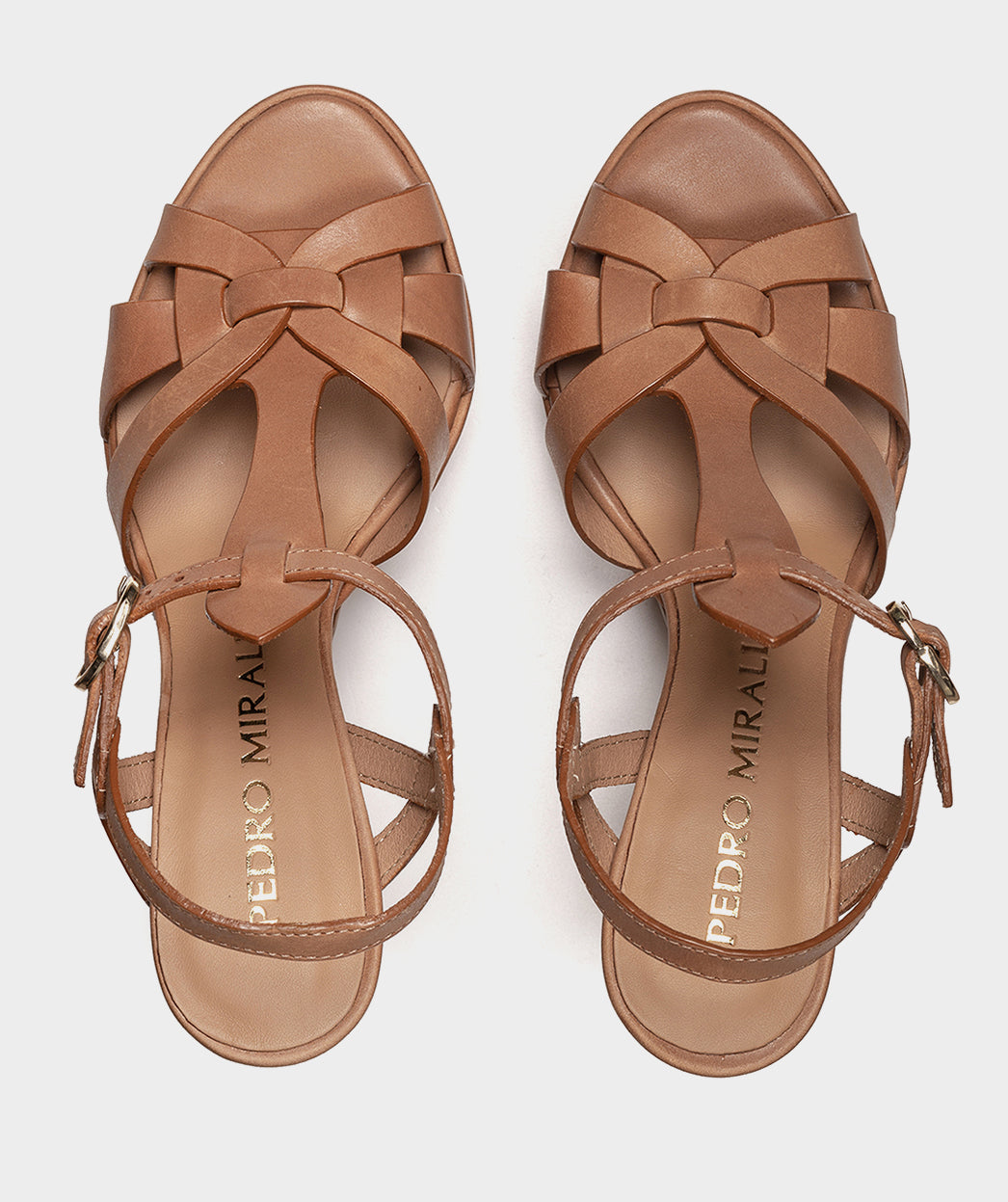 Sandalias de tacón de piel de color marrón. Una nueva versión del icónico modelo COPENHAGUE de Pedro Miralles. La opción perfecta para quienes apuestan por el tacón grueso.