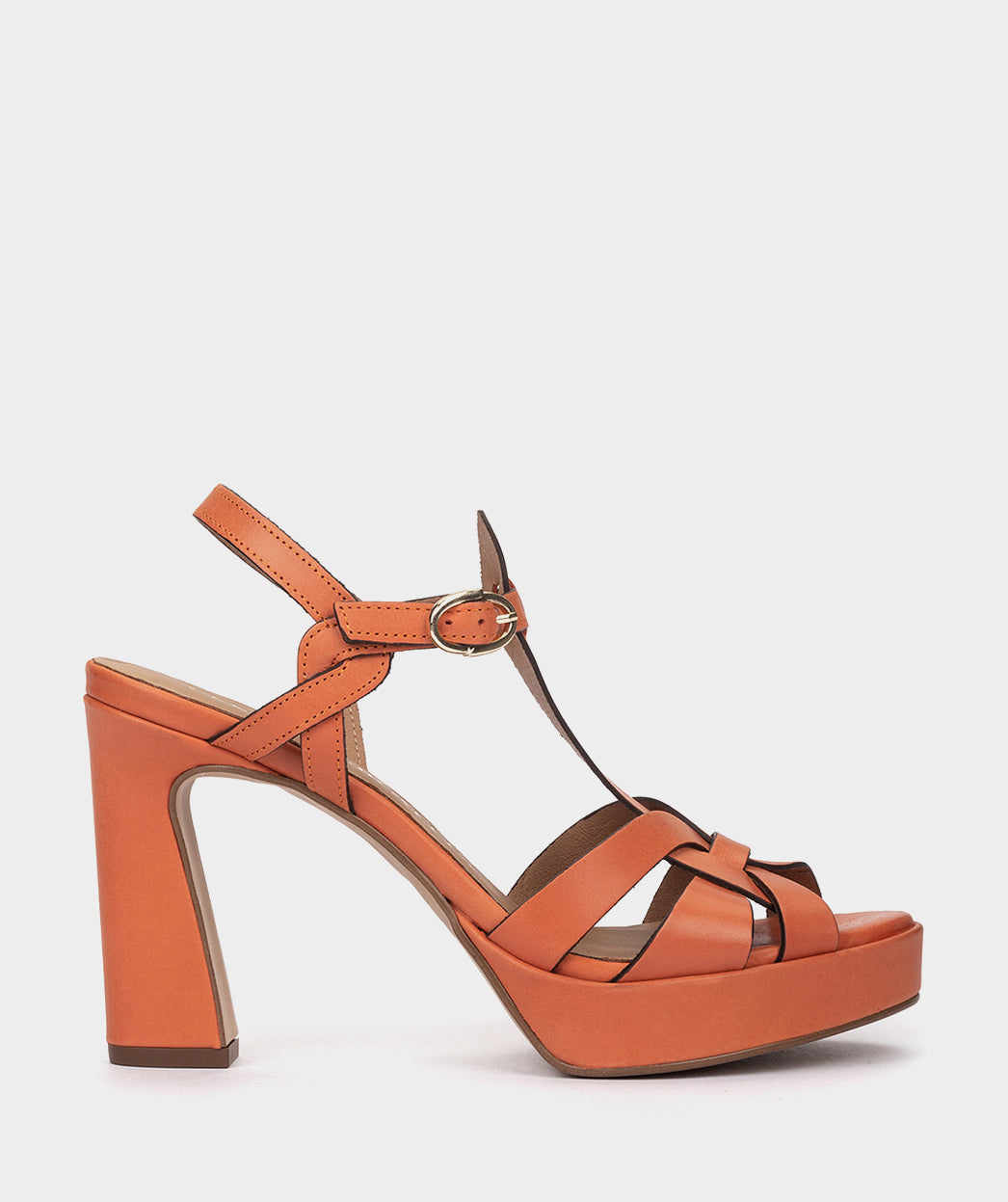 Sandalias de tacón de piel de color naranja. Una nueva versión del icónico modelo COPENHAGUE de Pedro Miralles. La opción perfecta para quienes apuestan por el tacón grueso.